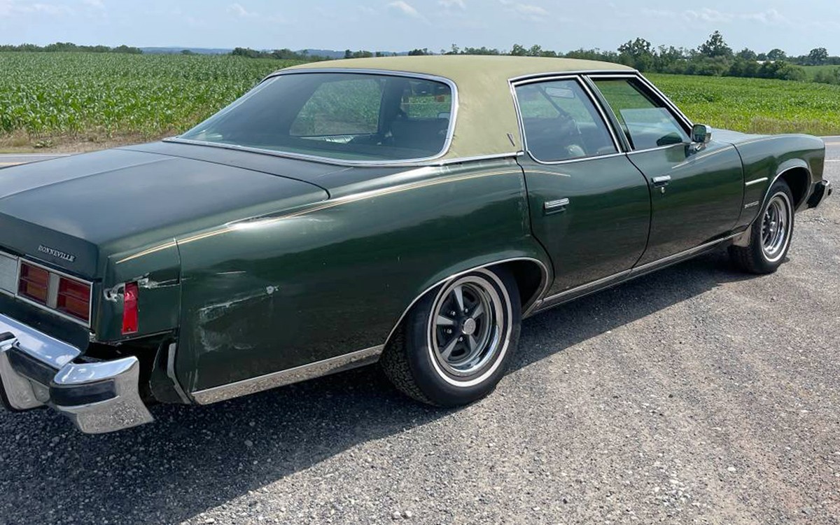 $4,000?! You can’t get anything for four grand anymore! I got incredibly excited seeing this car, this is my era, and I love these giant four-door luxury sedans from any manufacturer. We don’t see as many Pontiac Bonnevilles from this era for some reason, but they’re beautiful, despite the big 5 mph bumpers. You can see some missing trim on both sides, unfortunately, and there’s some real damage to mess with on the right side quarter panel.