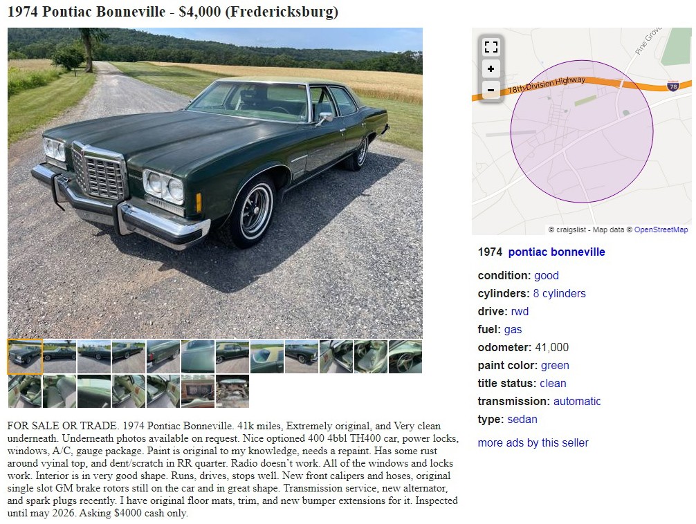 Pinemist Green is a perfect color for this 1974 Pontiac Bonneville. Nothing says the 1970s like green or brown, big chrome bumpers, and gigantic 19-foot-long American cars that get 11 mpg. There’s some work to do on this big cruiser, but if you’re up for it, you can find it posted here on craigslist in Fredericksburg, Pennsylvania, and the seller is asking $4,000. Here is the original listing, and thanks to Mitchell G. for the tip!