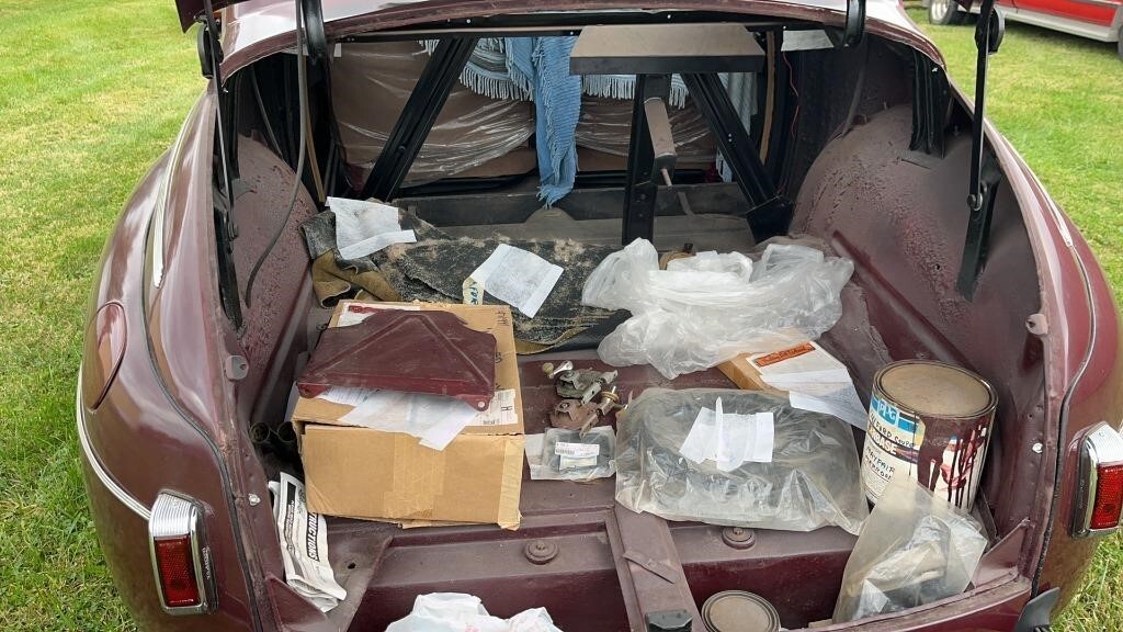 Looking inside the trunk area reveals one of the more curious aspects of this coupe. Its restoration seemed to start from the inside and the work moved out from there. Restoration work has taken place inside the car as evidenced by the can of paint, the fresh finish on the panels, and the removal of the panel separating the trunk from the passenger area. The headliner and seat upholstery may have been replaced as well. Coupes of this era are prone to trunk rust due to the slowly sloping sections where the trunk meets the rest of the body. The trunk rubber eventually deteriorates, and hard rains can overwhelm the gravity-assisted drainage and soak the interior areas. This is not helped by the usual mess that one finds in a trunk. Anything that can soak up moisture does exactly that and tends to supercharge the corrosion process.