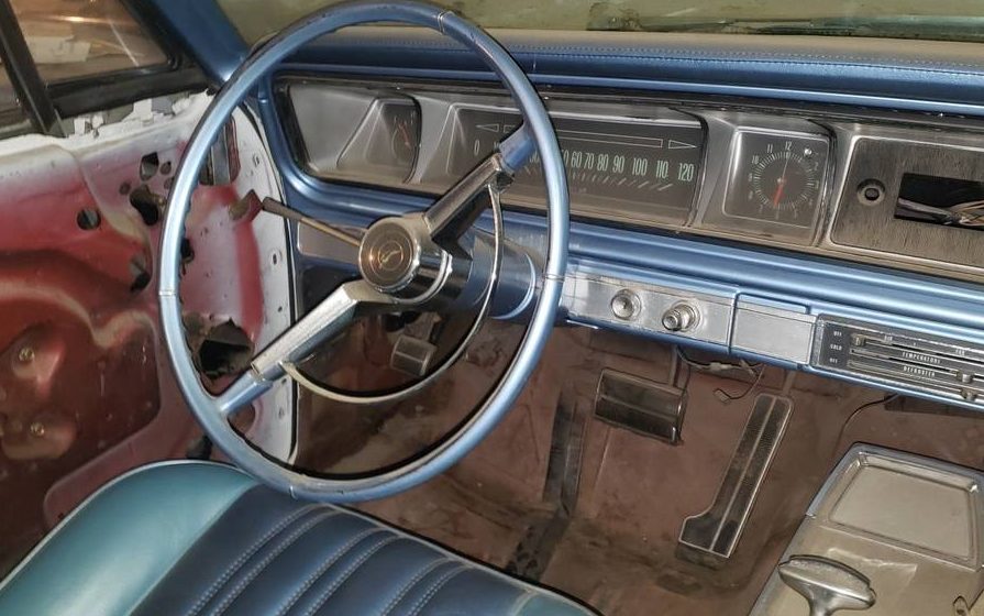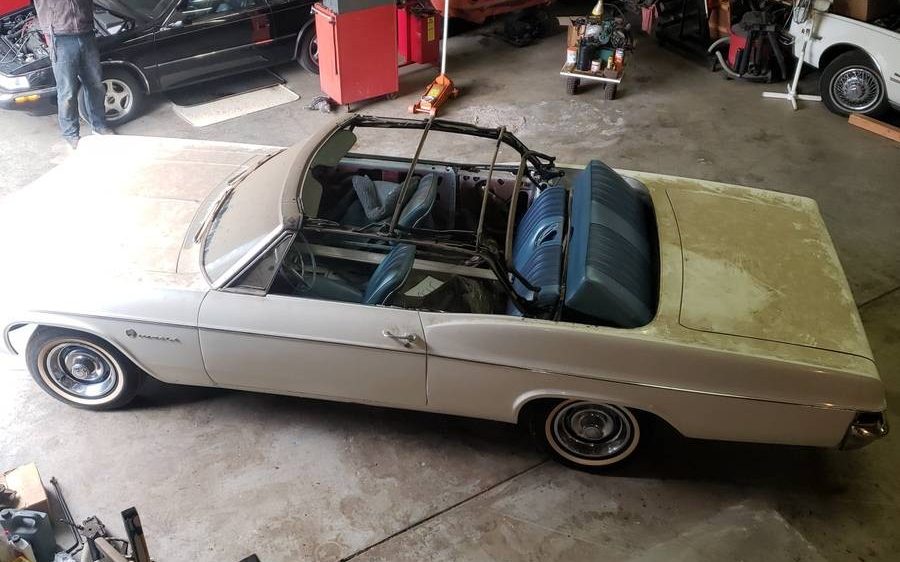 The interior shows another swap as this car has been outfitted with a center console and bucket seats, standard equipment on an Impala SS (model 6647), but not available, according to Chevrolet’s historical records, on other models except the Caprice coupe. It’s a nice swap, and assuming that’s the case, has been well executed. The blue color, code 836 is correct. The carpet is up and the floors are revealed, they look fine and a carpet is a sinch to find for one of these. The interior images aren’t clear enough to make out the upholstery’s condition but one can at least tell that the door and upholstery panels are missing. Note all of the dust – that’s what happens when you store a ragtop with the roof in the down position – of course, it doesn’t sound like there was much of a choice in this case.
