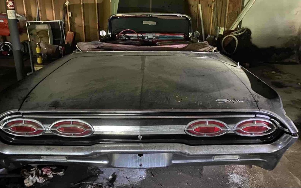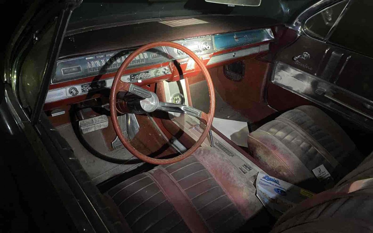 This 1962 example is listed as a twenty-six-year barn-bound find and is one of approximately 7,000 built that year. The seller claims that the body and trim are in fair condition but it is “a solid car needing a little TLC”. It would seem that it has been stored in a top-down mode which is generally not the best way to long-term park a convertible. I suggest that because the top boot is in place and looks like it has been for some time. Speaking of the top, there is no reference to it in the listing so it may or may not be useable – and generally, leaving one folded down for twenty-six years does it no favors. The very extensive “Starfire” stainless trim is intact and very presentable – good to know as a lot of it would probably be expensive and difficult to source if it were missing. Actually, the black lacquer finish may be salvageable, hard to say for sure with all of the dust covering the exterior surfaces. The Oldsmobile sales brochure for ’62 does not list fender skirts as an option so they may be an aftermarket accessory.