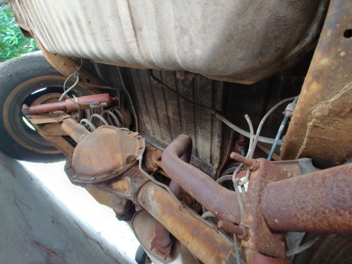 The interior is in surprisingly nice shape. The tan bench seat looks like a redo though the carpet appears to be original and in only fair shape. The headliner, door panels, and instrument panel show well, but the dash topper is usually evidence of a pad problem. The original radio has been swapped for an aftermarket piece but the rest f the environment shows as original. This is an A/C-equipped car but there is no mention of its operational capability and that may be due to a missing compressor and an evaporator that looks disconnected in front of the expansion valve.