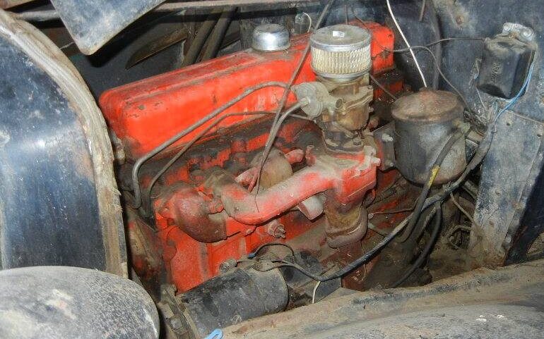 Interestingly, the original 60 HP, 207 CI, in-line six-cylinder engine appears to have been swapped for something later, perhaps a 216 or 235 CI, six (no center valve cover bolts now). It’s a dated engine with its canister oil filter and generator which probably dates it to pre-1963. A runner? I wouldn’t count on it. The transmission should be a three-speed manual unless somehow, an alternate gearbox was swapped in with the engine change.
