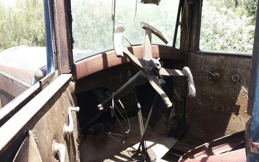 The interior of this coupe is spent. There is a seat frame, remnants of a wooden steering wheel and trashed door cards, not much else. Floorboards, which are literally boards, need some attention too. There is no visible instrument panel but it is hard to tell if that is by design or the result of happenstance.