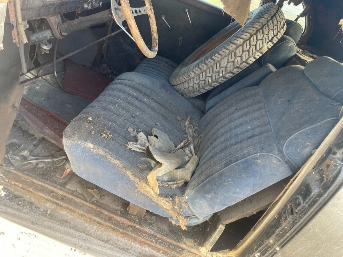 1972 plate on the front, 1937 plate on the rear, 50’s style whitewall tire ,60s-70s steering wheel and 80s looking velour seat – when did this car finally get parked ?