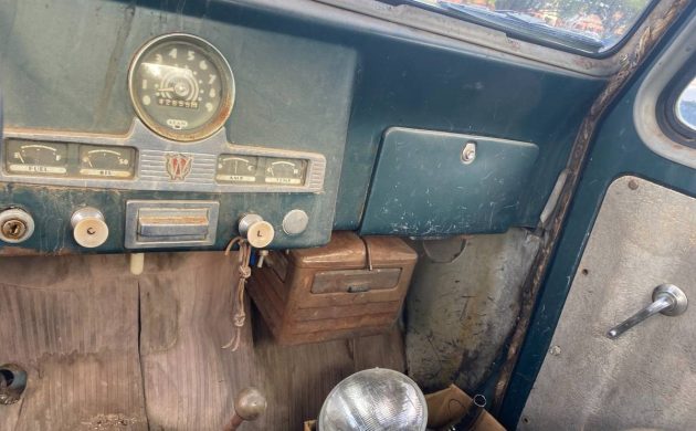 Being the heir to this Willys, the seller only seems to know a few things about it. Most importantly, it was running and driving two years ago, which is good news. The engine is Willys’ F-Head 134-cubic-inch four with 72 horsepower. It drives a Warner three-speed manual, a Spicer Model 18 transfer case, a Spicer Model 25 front axle, and a Timken Model 51540 rear axle. The standard gearing (front and rear) was a steep 5.38:1. The going would be slow, but am I wrong to think that something like a 283 Chevy or a 289 Ford would make for a cool ’60s-style retromod?