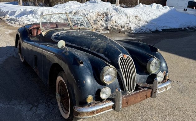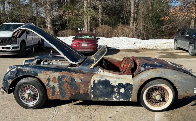 In Hanover, Massachusetts, on eBay is this needs-everything 1956 Jaguar XK140MC roadster. The dealer-owner says it comes with a factory-installed C-Type head and wants $29,500 (or best offer). In today’s market, that’s going to be a stretch. We’re told virtually nothing about the car, other than that it’s a barn find, has matching numbers, and comes with a clear title. They were available with an automatic, but this one appears to be manual. The wire wheels were an option. The standard discs were good-looking, too, and required less maintenance.