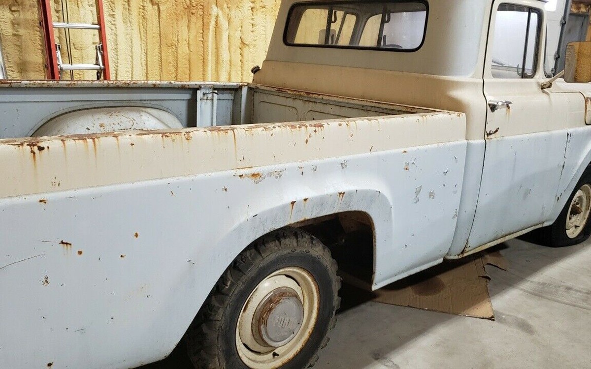 I have a soft spot for a three-on-the-tree manual shifter having driven a Dodge van with one for years and my brother had a 1964 Ford pickup with a column-mounted manual shifter. That’s what this truck has and you can see that the interior looks great in the photos. The seller found this truck somewhere five years ago and they refer to it as a barn find, but it isn’t currently a running and driving truck.
