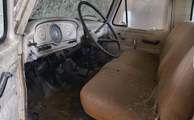 The Sandshell Beige paint is well-hidden under decades of dust and/or other barn debris. We don’t know how long this 120-inch wheelbase, 8-foot-long-bed Flareside (there was no 6.5-foot bed 4×4 in 1962) has been sitting here, but man, it’s been a while. If I had gotten Amazon stock in 1999 rather than wondering what the heck this weirdo company was and how it could possibly make money, I’d buy this truck and have it turned into a Pebble Beach-winning bone-stock thing of beauty. Sadly, that never happened. I made $24,500 a year in 1999; there wasn’t much left over for buying stocks.