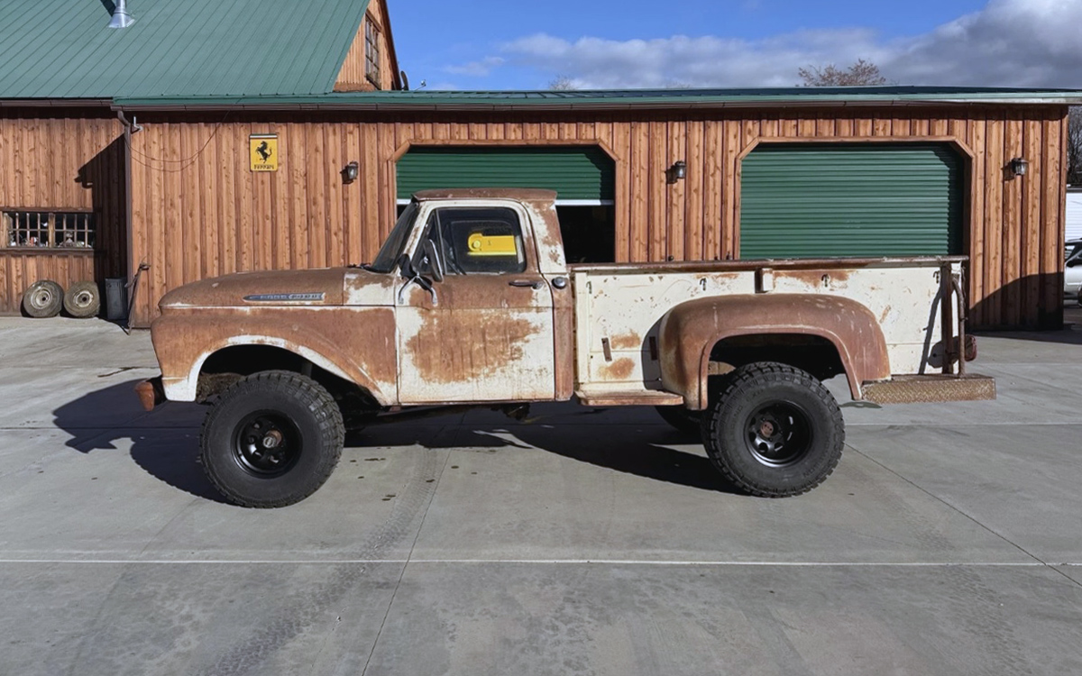 Auction update: the second time around, all cleaned up, and wearing big wheels and tires (at least for the photos), this ’62 F-100 4×4 only made it to $5,500, and the auction ended with presumably no sale.