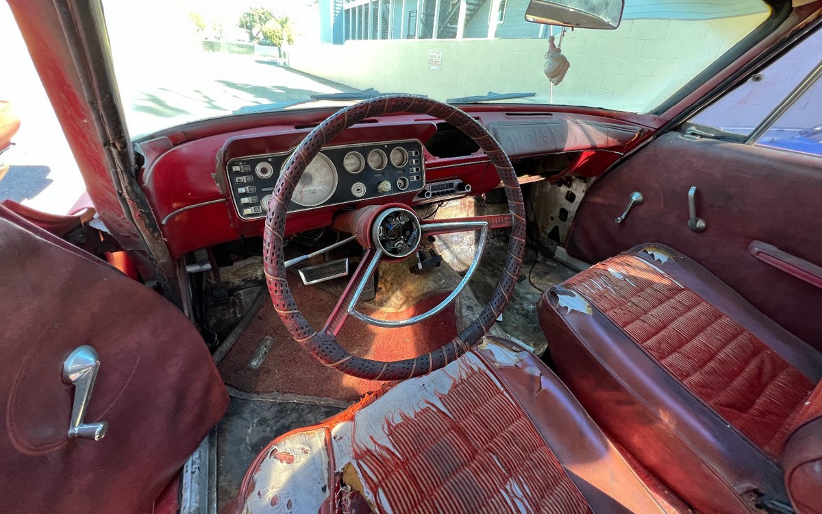 You can see that the badge on the trunk here is almost as big as a spare tire, that’s one big badge. The first two model years had tail lights integrated into the ends of the rear fins but those also went away for the 1962 year as you can see above. Good news: this one has keys, but not much air in the tires. The seller says that they bought this car from the original owner’s family but we don’t know when that was. Clearly, it’s not in the best condition but appears solid from the exterior.