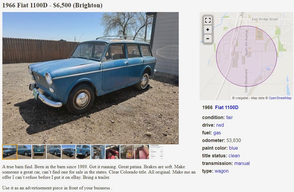 About as close to an Italian “wagon” as most of us are likely to see on the road today would be an SUV: a used Maserati Levante or an Alfa Romeo Stelvio or Tonale, which are often much cheaper than a used Maserati SUV. For $6,500, you can have this 1966 Fiat 1100-D Wagon that’s posted here on craigslist in Brighton, Colorado. Here is the original listing, and grazie to Mike F. for the tip!