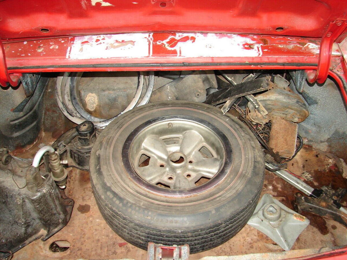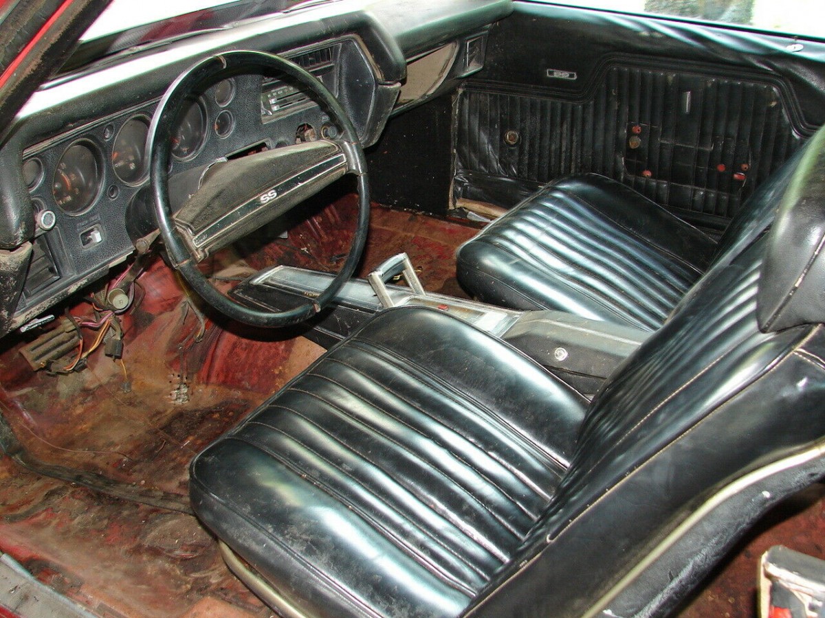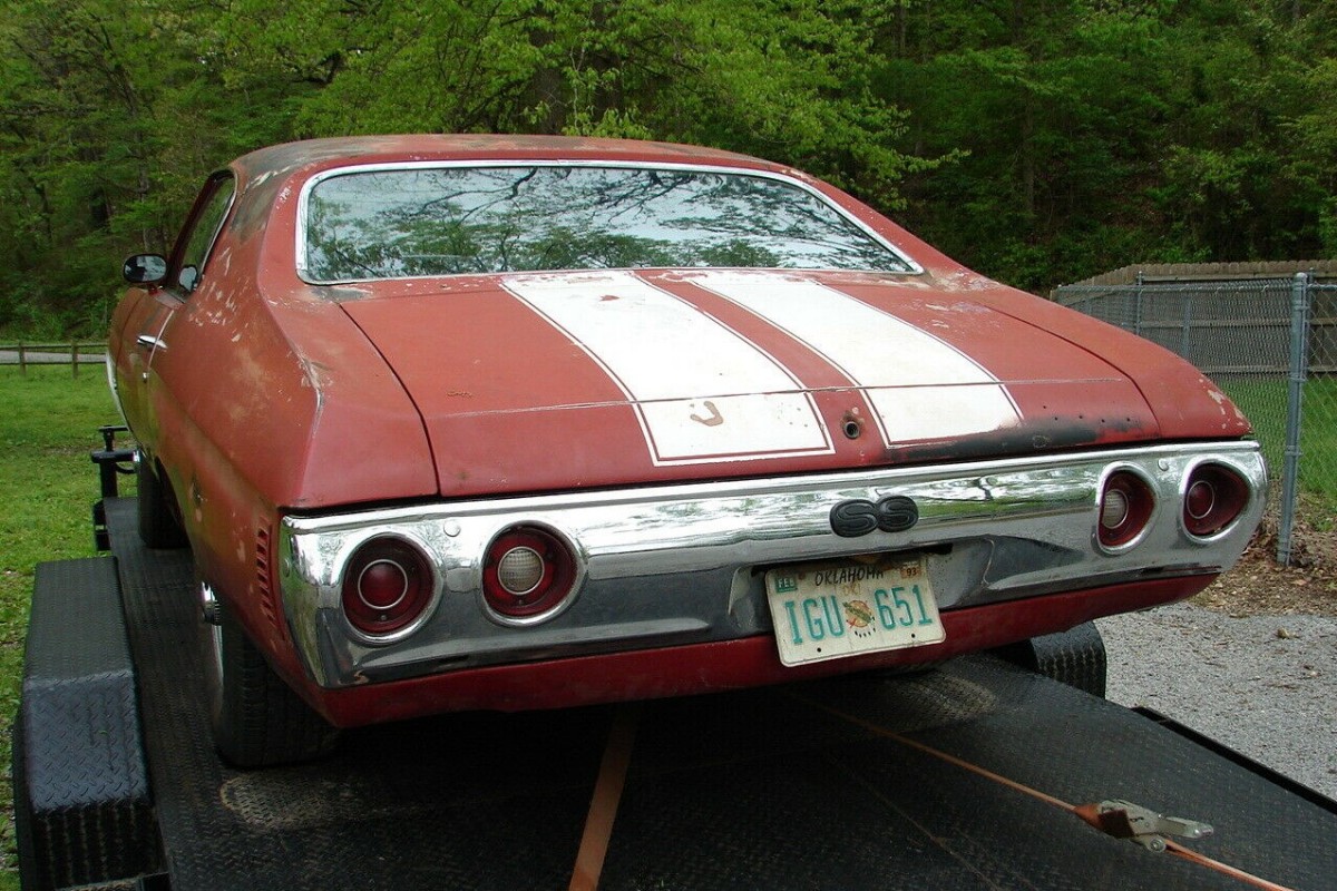 When new, this Chevrolet was finished in Cranberry Red with a white vinyl top and Saddle Tan interior. The machine has received at least one repaint with white stripes and the vinyl top was removed years ago. The interior has changed colors to black and the seats look to be in surprisingly good condition. The windshield is MIA, but the rest of the glass is still there. The trunk is full of parts, including some A/C equipment and one SS wheel. The car rolls on tires mounted to 1970-era Rally wheels.