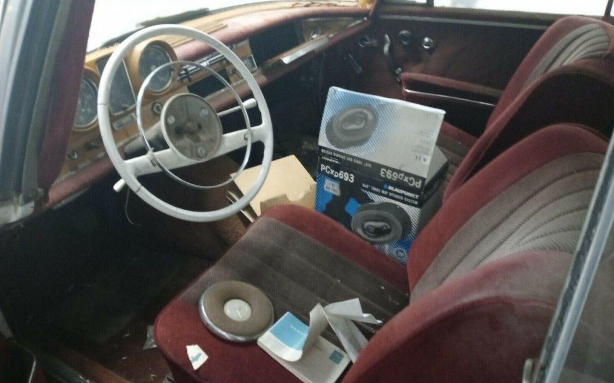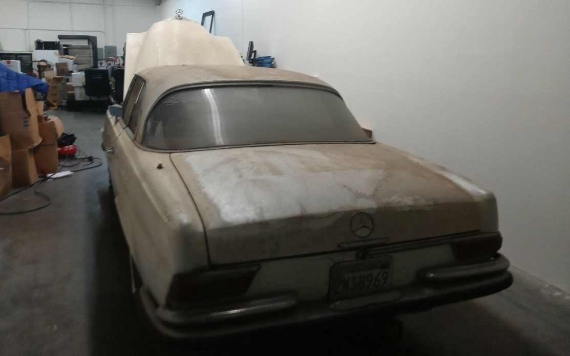 Described as a true barn find, this Mercedes does appear to have been snoozing for some period of time. It’s difficult to get a good look at the finish and body due to the dirt and poor lighting, however. The body looks straight and without significant rust, though there is some of the surface nature cropping up in places and the driver’s side fender possesses some notably checked paint. The trim all seems to be mostly present, other than the aforementioned truck lid badge which would help with model identification. The best feature of this coupe, IMHO, is the Paul Bracq penned C-pillar; it really sets this coupe apart from others of the time and is a distinctive Mercedes-Benz trait.