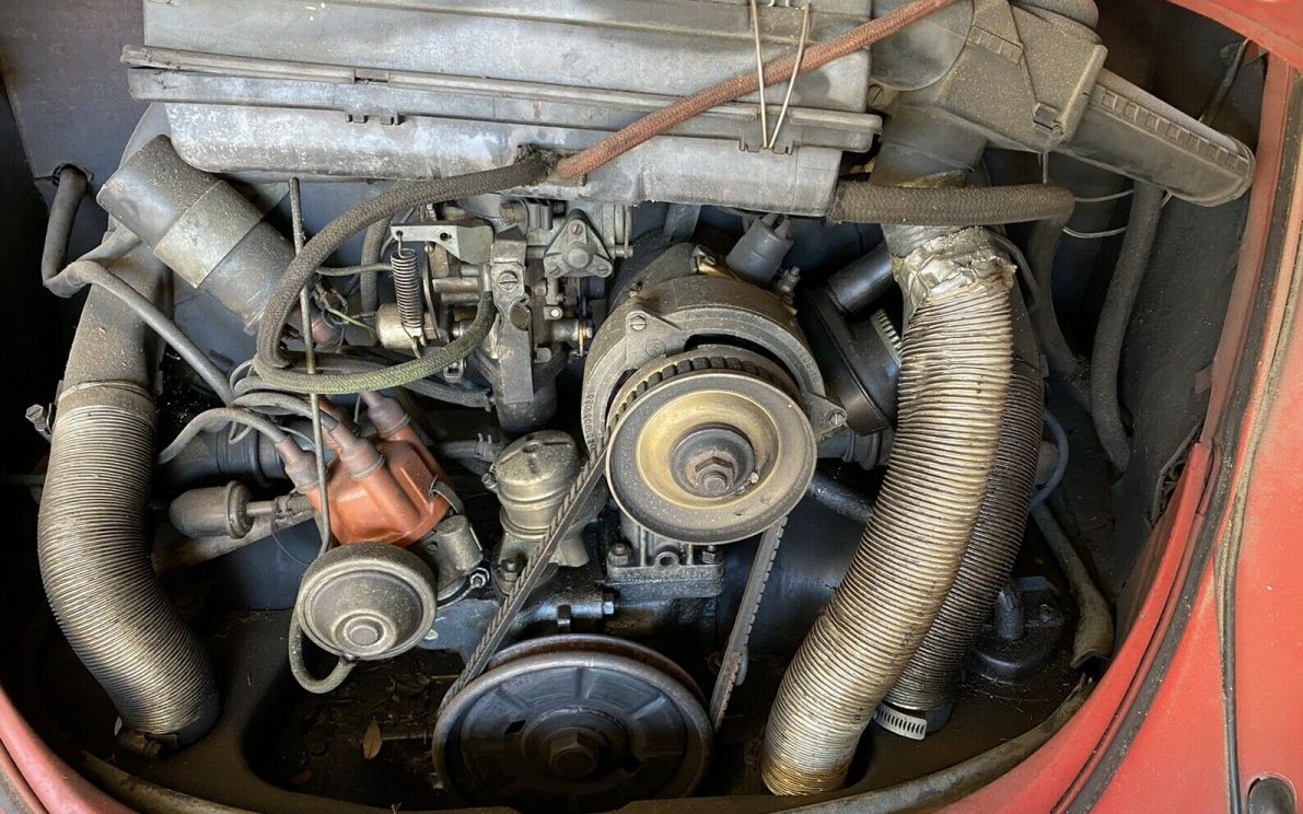 Power is provided by a 58 HP, 1600 CC, flat four-cylinder engine. The motor in this Beetle will turn but it will not start – at least it’s not seized! And being air-cooled there is no ancient, cruddy coolant and a rotted out radiator to contend with. Nothing looks amiss in the engine compartment so hopefully, it will no take a lot of coaxing to get this VW to fire. The rear-mounted engine is attached to a four-speed manual transaxle.