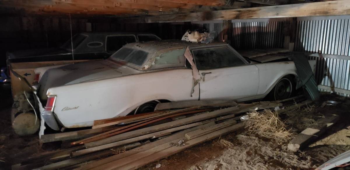 1971 – Continental Mark III; white in color with a vinyl top that has mostly peeled off; some potential rust brewing in the lower rear quarter panel