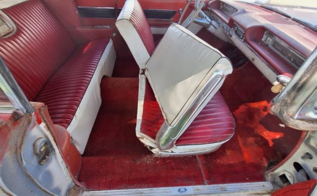The two-tone Olds seen here was owned by a large family with a flurry of children (6 girls). We’re told they may have put on a lot of its 124,000 miles during their collective years in high school. The last time it was driven is estimated to be around the turn of the century. Fortunately, the barn was well-sealed and dry, which helped keep rust to a minimum (although some remains). The red/white paint has, of course, run its course, but the matching interior is surprisingly better than you might think.