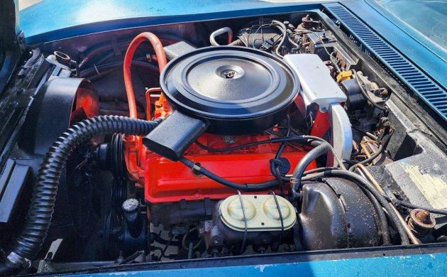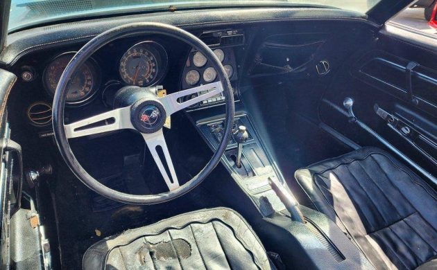 It appears that some fresh paint has been applied under the hood, at least on the easily accessible upper components, with overspray hitting a couple of fan blades. The engine is said to be a 350, but the seller notes NOM, an abbreviation for non-original motor. The small block is also described as non-running, with no additional details, so it’s unknown if the crank will still rotate. A missing radiator cap isn’t a good sign that this one’s had its coolant maintained, and there’s also no indication of how long this Corvette has been inoperative, and no word on the present state of the automatic transmission.