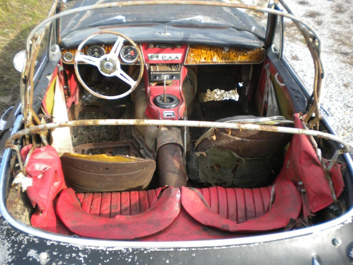 And what a shame it is to lose this particular car when you see this interior. Can you imagine how stunning it must have been? The wood trim still hanging onto the glove box door is another reminder of how handsome British roadsters are when the leave the factory; sadly, they don’t take kindly to poor storage and years of neglect. The seller pulls no punches in the listing when describing how rotten the car is, from the body to the floors and seemingly everything in between. The top frame is still hanging on but obviously, the leaky barn has done away with the top material.