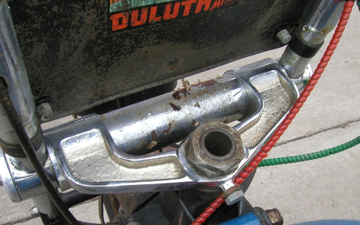 I like this photo for the Duluth connection. I have no clue what that says, is it one of those vintage travel stickers that we used to put on our campers or station wagon windows? The seller says that this one is original but they only came in a burgundy color with nice Indian graphics so this one has been painted at some point. It should be restored back to its original spec and color, in my opinion as it’s a very rare motorcycle to see today. The Indian Papoose bikes were mostly badge-engineered Corgis but they added a headlight and a brake light, although many Corgis also had those features. The Indian Papoose was made from 1947 to 1954.