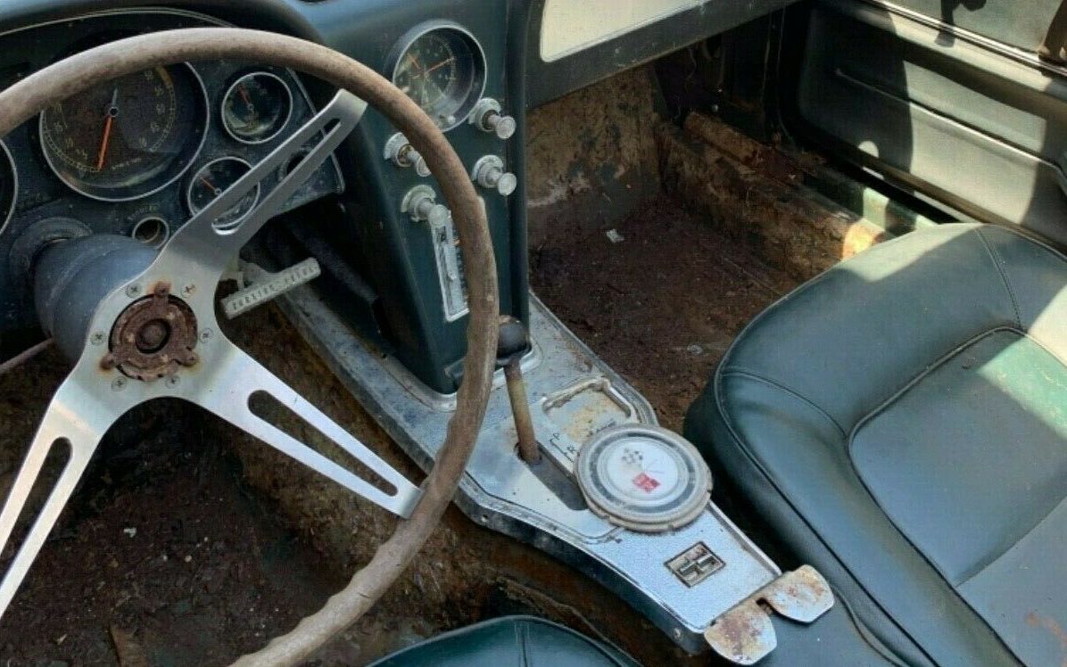 The interior has some major floor issues going on. The seats and instrument panel appear reasonable though. Of note is the center console-mounted power window switch. This Corvette appears to have been optioned as a cruiser with power windows, power steering, power windows, automatic transmission, and a mild horsepower engine. It was probably a very nice two-seater in its long-ago day sporting a Glen Green exterior and a Dark Green interior. What a shame!