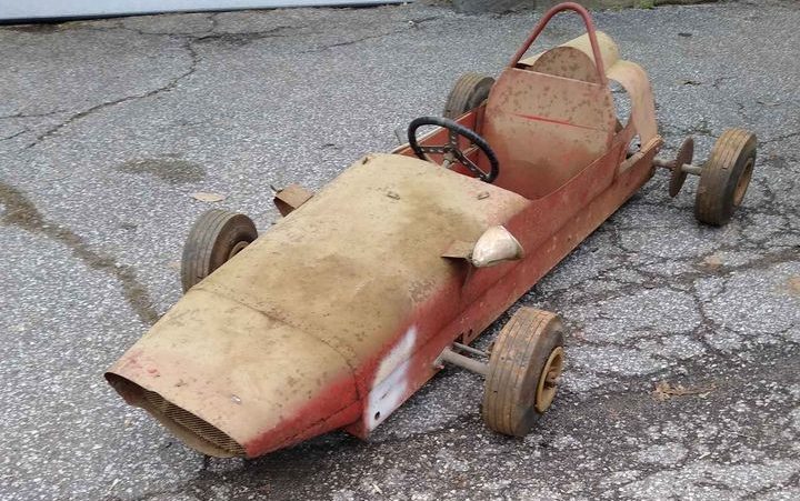 Here’s a fun one, to shift gears from Flintstone Nissans and such. While I’ve never seen this particular kart, in the 60’s, the British were very proud of the Lotus racing team. They literally cleaned up on the Offy’s at the time. The racing sounds went from the low growls of the Offy’s, to the whine of the Lotus. It was the end of an era for Offenhauser, which had dominated racing up until then. As a kid, we would make wooden push karts with that front end. Jim Clark was my boyhood hero, of sorts, and I made several models of the Lotus. I, along with many, was devastated when he was killed.