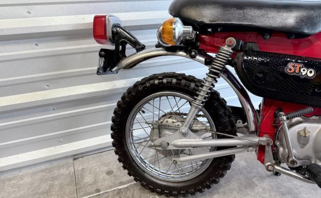 The engine sure looks clean and nice, much nicer than I expected. It’s Honda’s 89-cc OHC four-stroke single with 5.5 horsepower. Backed by a three-speed semi-automatic transmission, it’s also wearing a replacement carb and has some starting issues. It’s unlike a typical Honda in taking 5-10 kicks to start it. I’d guess it’s a simple timing or points issue, but who knows? Have any of you heard of the ST90?