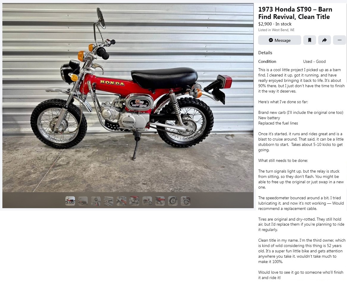 ST, CT, SL, CL, let’s call the whole thing off... Honda’s naming system left more than a few of us scratching our skulls, since this 1973 Honda ST90 can be considered part of the CT family. This former barn find bike is listed here on Facebook Marketplace in West Bend, Wisconsin, and the seller is asking $2,900. Here is the original listing, and thanks to Lothar… of the Hill People for the tip!