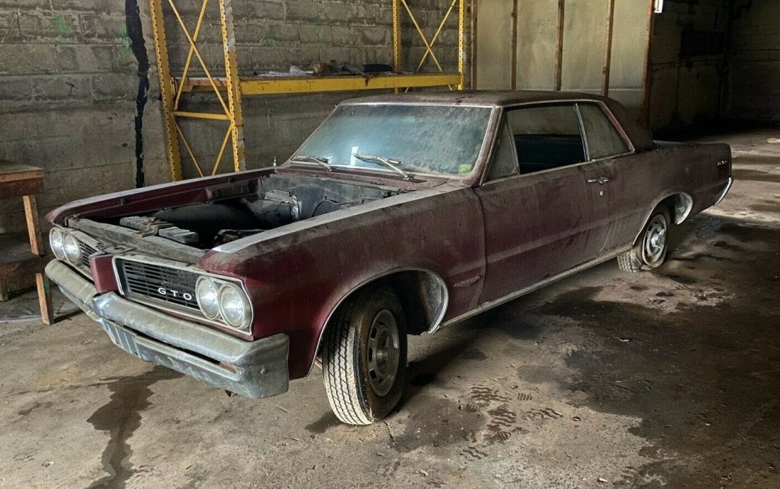 The GTO. Gas, Tires & Oil. GOAT. The car that’s credited with starting the mid-1960s mid-size muscle car movement. While GTO co-father John DeLorean thought that was an untapped market for a car like this, internal GM pundits thought they’d sell maybe 5,000 copies. 1964 first-year sales topped 32,000 units, so John was right. This ’64 GTO 2-door hardtop is a roller at this stage, without a motor, exhaust system, and hood. However, the body looks pretty solid from what we can see, although quite dirty inside and out. It is or was located in a barn in Owings Mills, Maryland, and available here on eBay where the bidding is holding at $4,000.