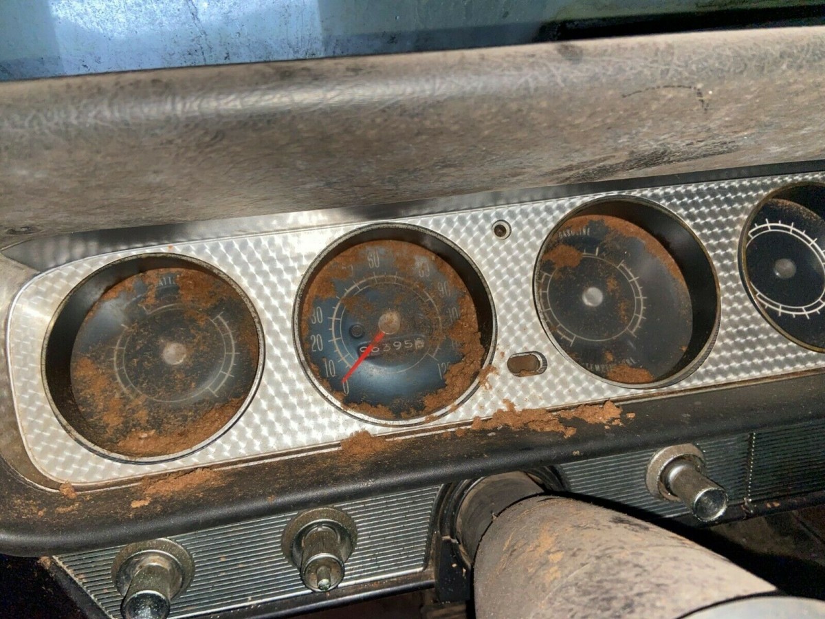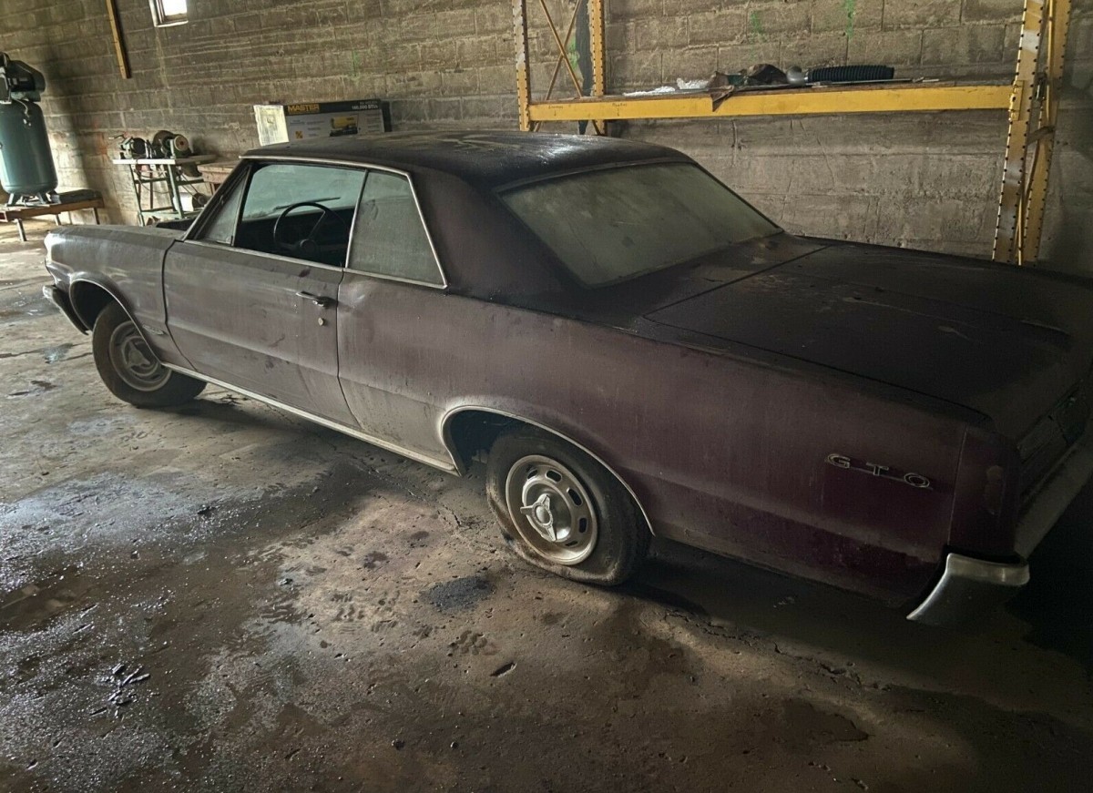 While the exterior wear layers and layers of dirt and grime, the interior has some of the same, an indication that the windows were left down for years. Damage seems minimal and the car may look better given a serious and thorough cleaning. Besides bucket seats, the GTO has a console and a wood steering wheel. All the original wheel covers are present, although at least one tire is flat. Bring an air pump along with your trailer to load this baby up. These cars regularly trade for north of $50,000 when in proper condition, so there seems to be plenty of room to bring this car back to life.