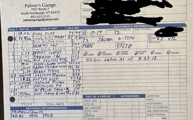 Probably the most surprising aspect about this listing is that no photo is provided from under the hood of that V12, but we do get to view a receipt from nearby Palmer’s Garage detailing a host of replacement parts they’ve installed dating back to 2014. The seller tells us he found the Jaguar sitting in a barn and took it from a non-running condition to a vehicle you can proudly drive, with some more good news being the engine is still the original numbers-matching component. A couple of issues mentioned are a leak around the oil filter housing and some shaking when the car hits 50 MPH, but simply balancing the wire wheels is believed to be a remedy for the latter.