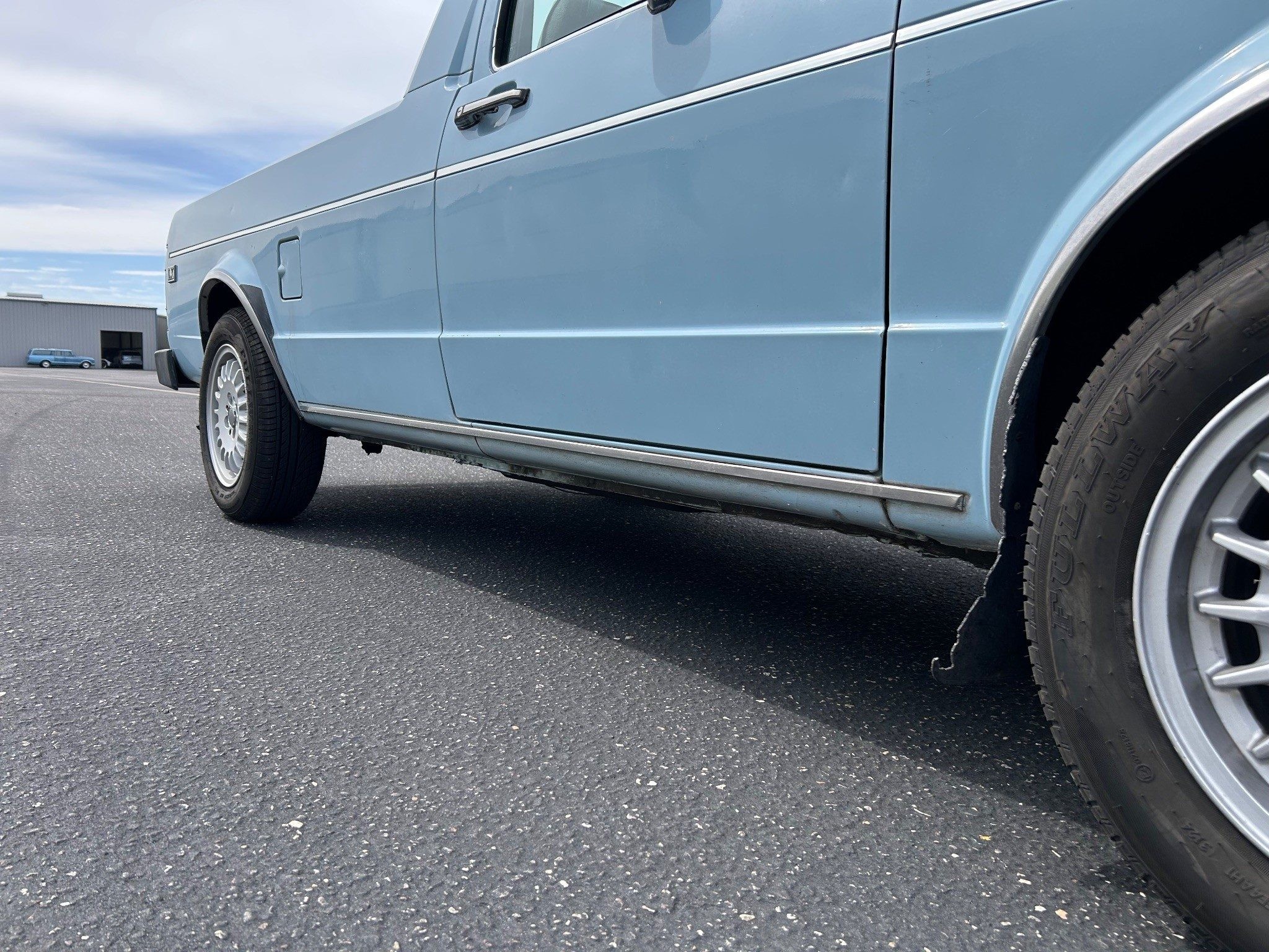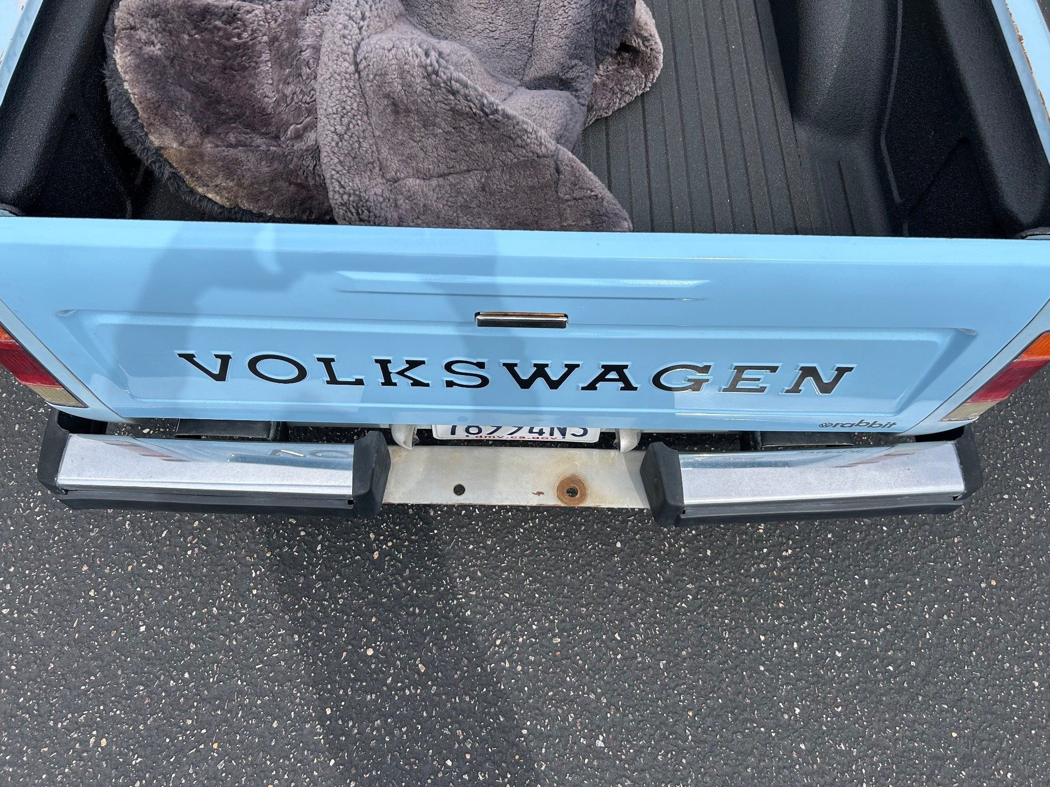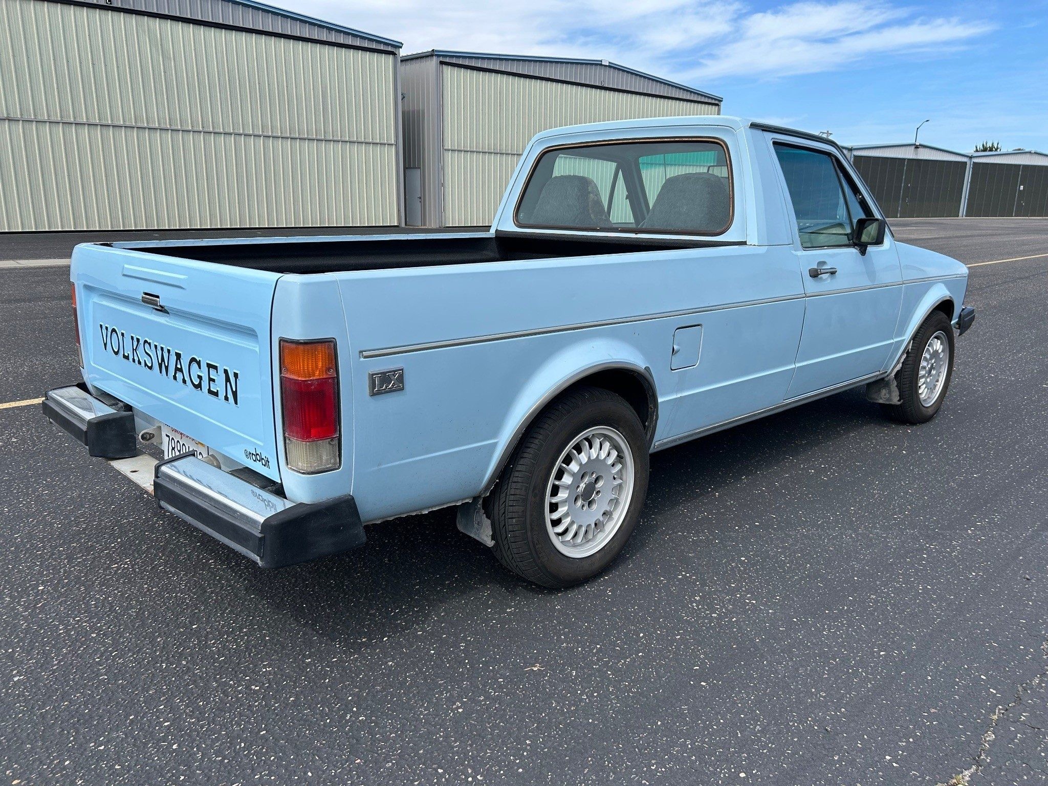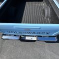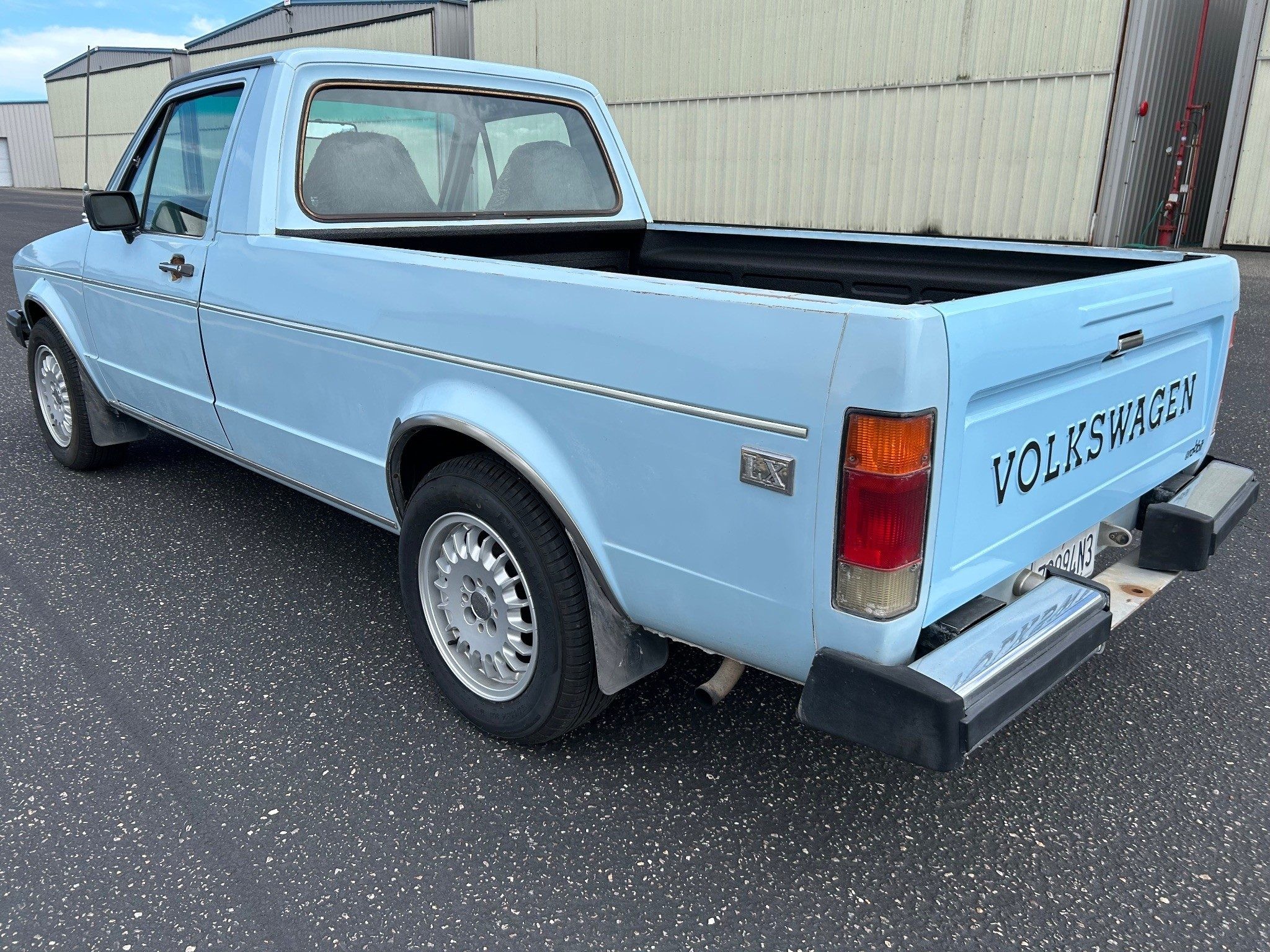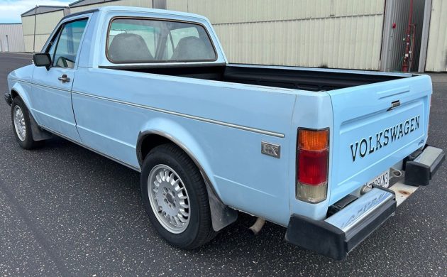 The first-generation “Caddy”, or VW Pickup, was made from 1979 through 1995 here and longer in South Africa. This was it for body styles; there was no four-door sedan pickup. If I had time, I’d whip one out (in an hour or two) in Photoshop just to see how it looked. The seller has absolutely outdone most sellers in providing such great photos, very, very well done! Inside the pickup bed looks nice with a new sprayed-on bedliner. The only thing I notice outside, other than a few normal nicks, is that the tailgate has been repainted. They say it’s wearing its original Lago Blue paint otherwise. Speaking of original, the BMW wheels aren’t original, of course, but the seller is including the original wheels and hub caps with the sale.