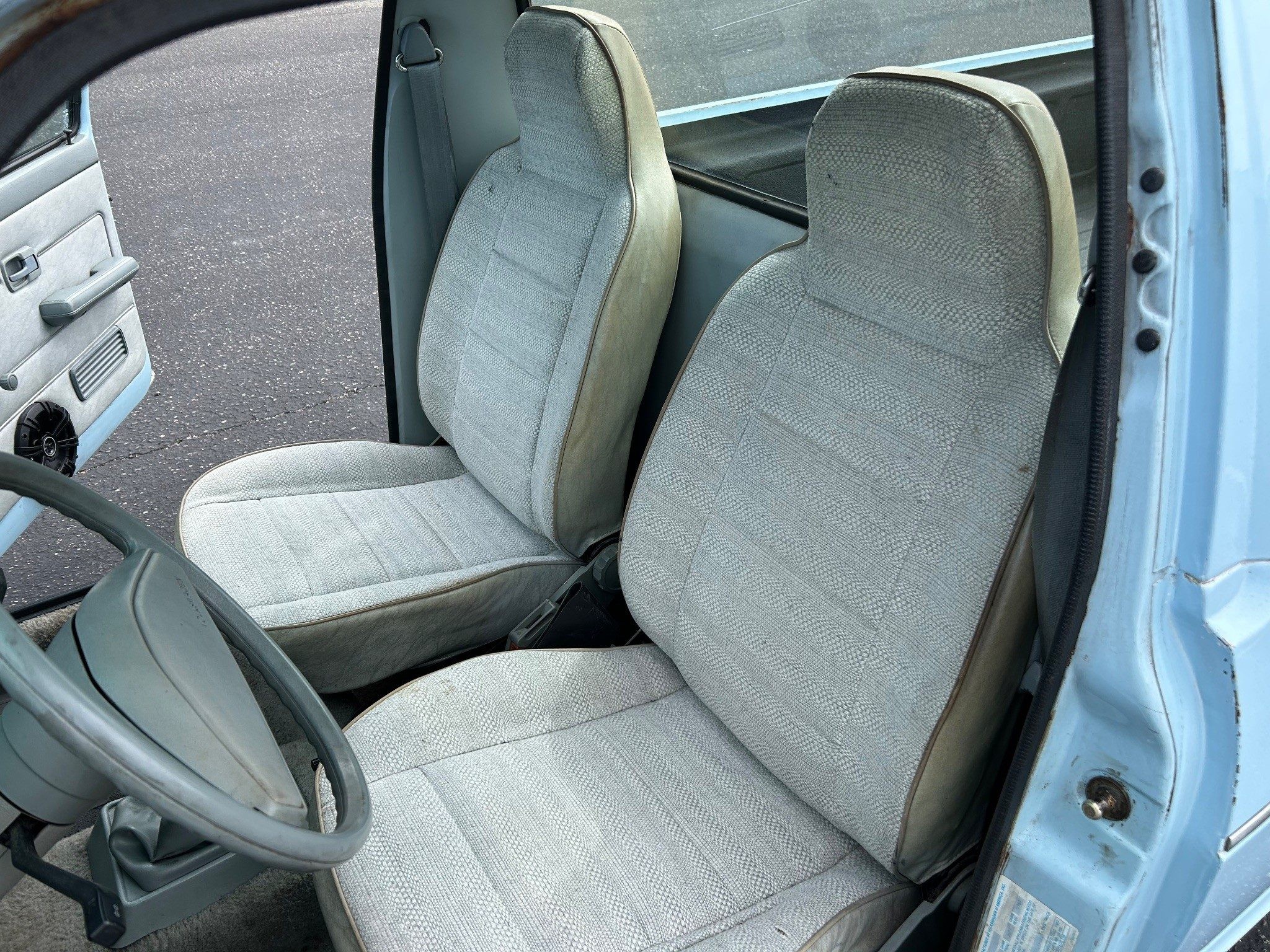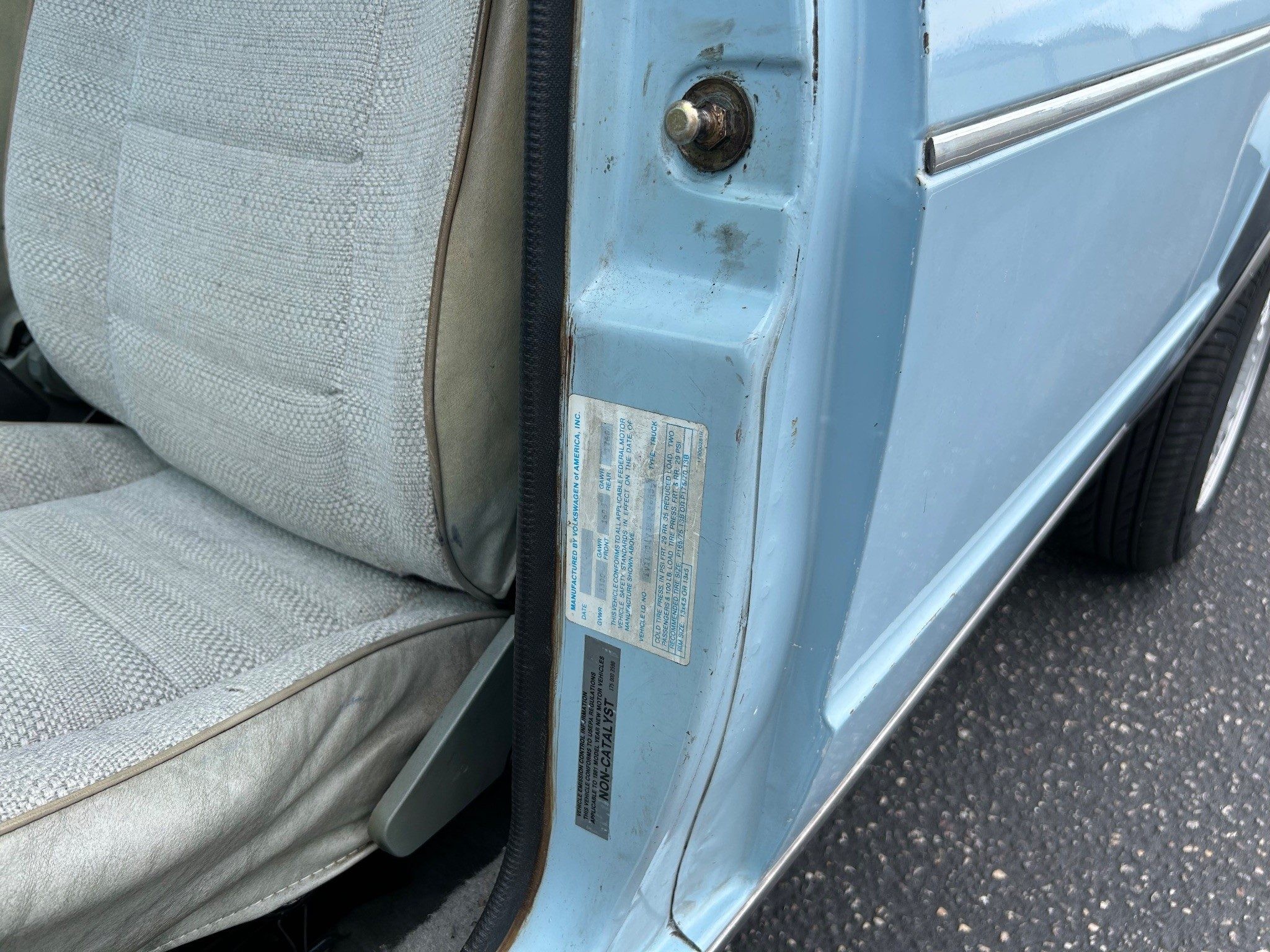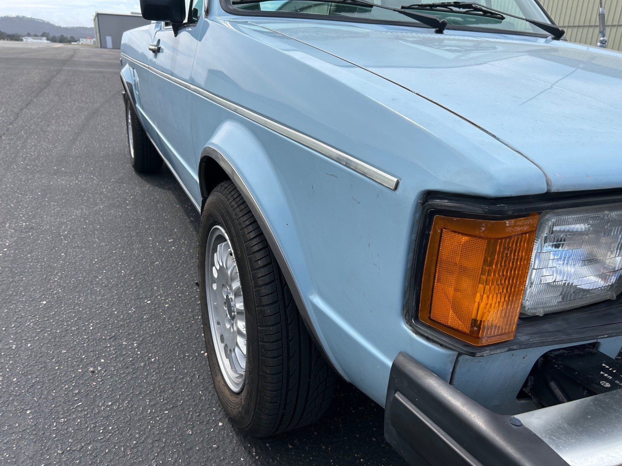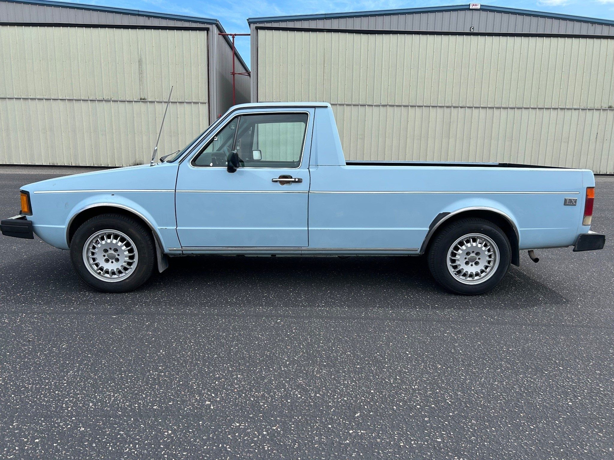The first-generation “Caddy”, or VW Pickup, was made from 1979 through 1995 here and longer in South Africa. This was it for body styles; there was no four-door sedan pickup. If I had time, I’d whip one out (in an hour or two) in Photoshop just to see how it looked. The seller has absolutely outdone most sellers in providing such great photos, very, very well done! Inside the pickup bed looks nice with a new sprayed-on bedliner. The only thing I notice outside, other than a few normal nicks, is that the tailgate has been repainted. They say it’s wearing its original Lago Blue paint otherwise. Speaking of original, the BMW wheels aren’t original, of course, but the seller is including the original wheels and hub caps with the sale.