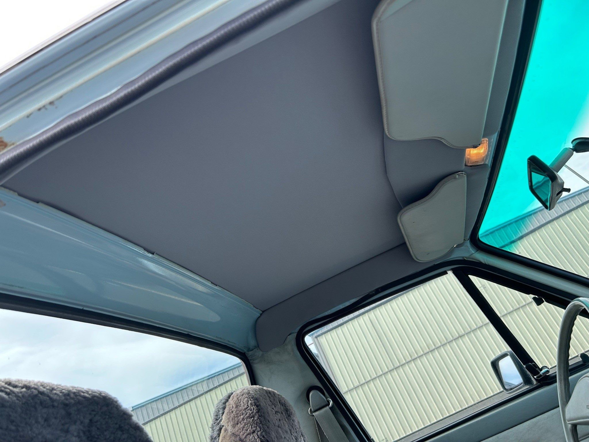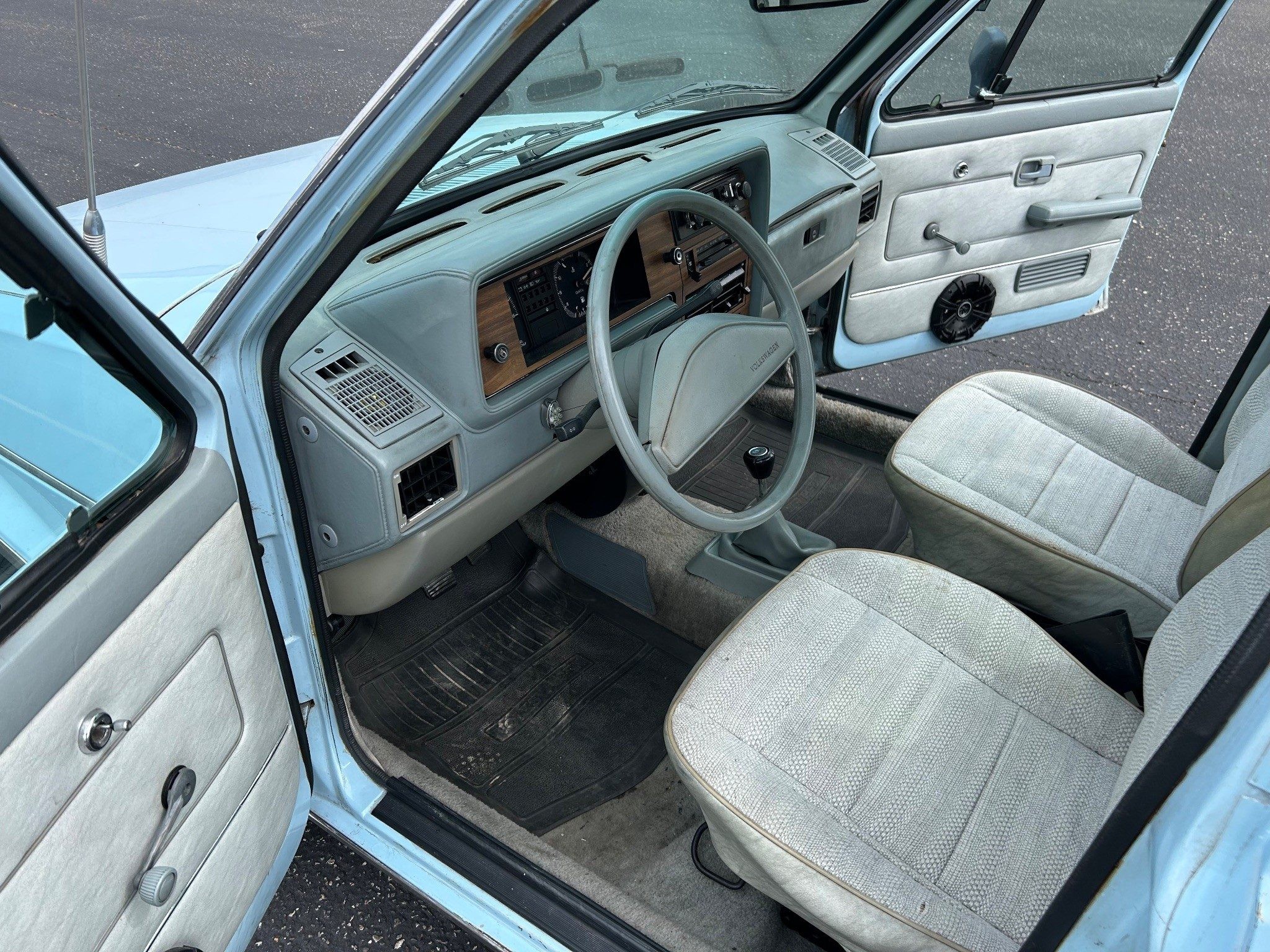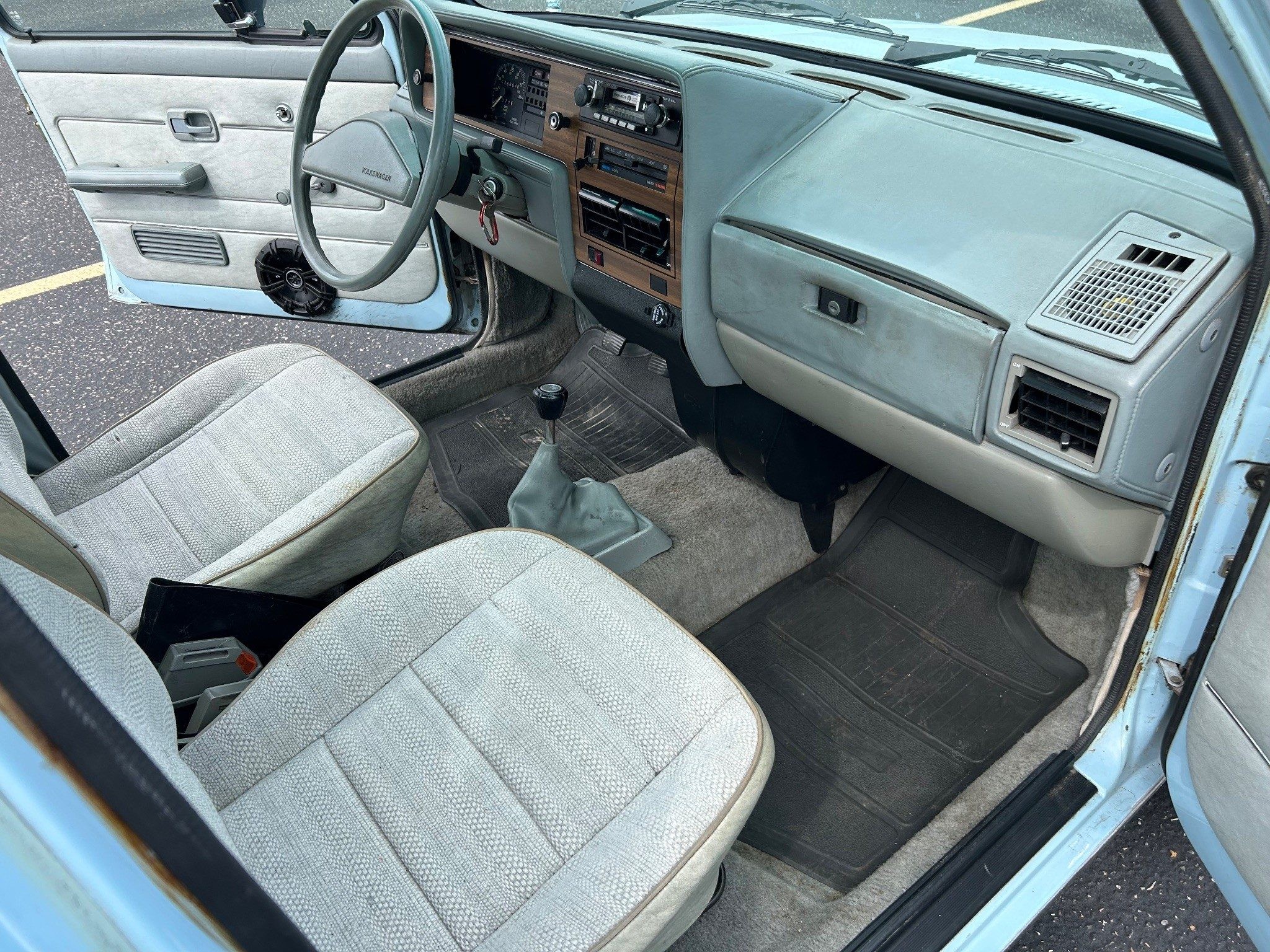 There may be a bit of fading here due to the fact that this rock-solid VW pickup was bought in New Mexico and now resides in California. The glorious sun has faded things a bit, but has seemed to otherwise preserve the precious metal bits. The underside looks amazing, as expected. This one has a five-speed manual because it has a diesel under the hood. Otherwise, it would have had a four-speed manual, an automatic wasn’t available in this generation. It also has a new headliner.