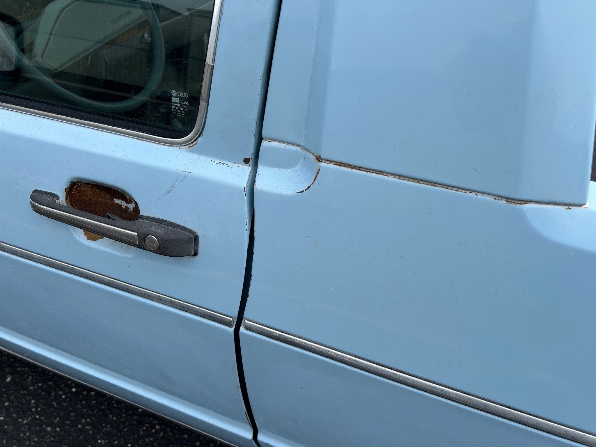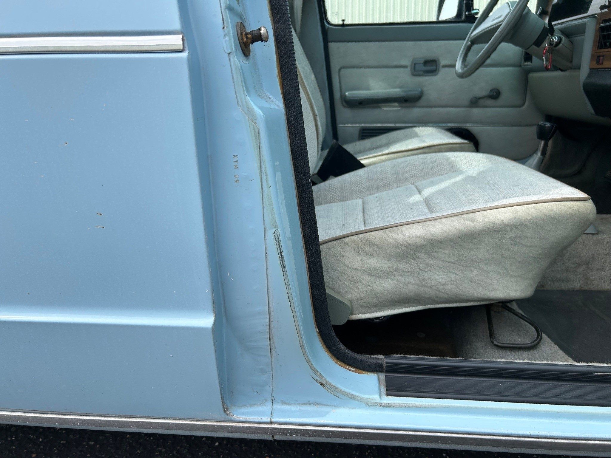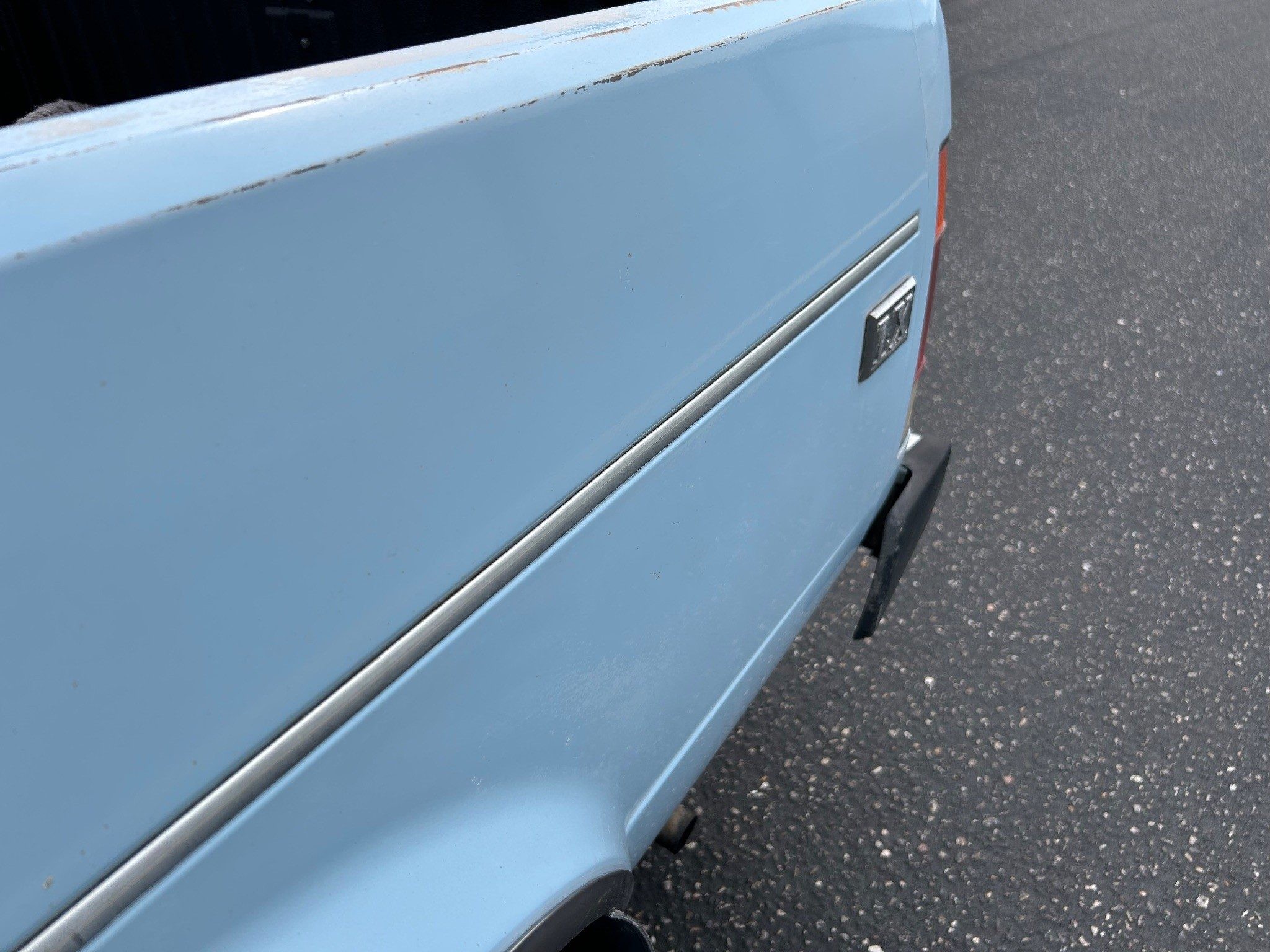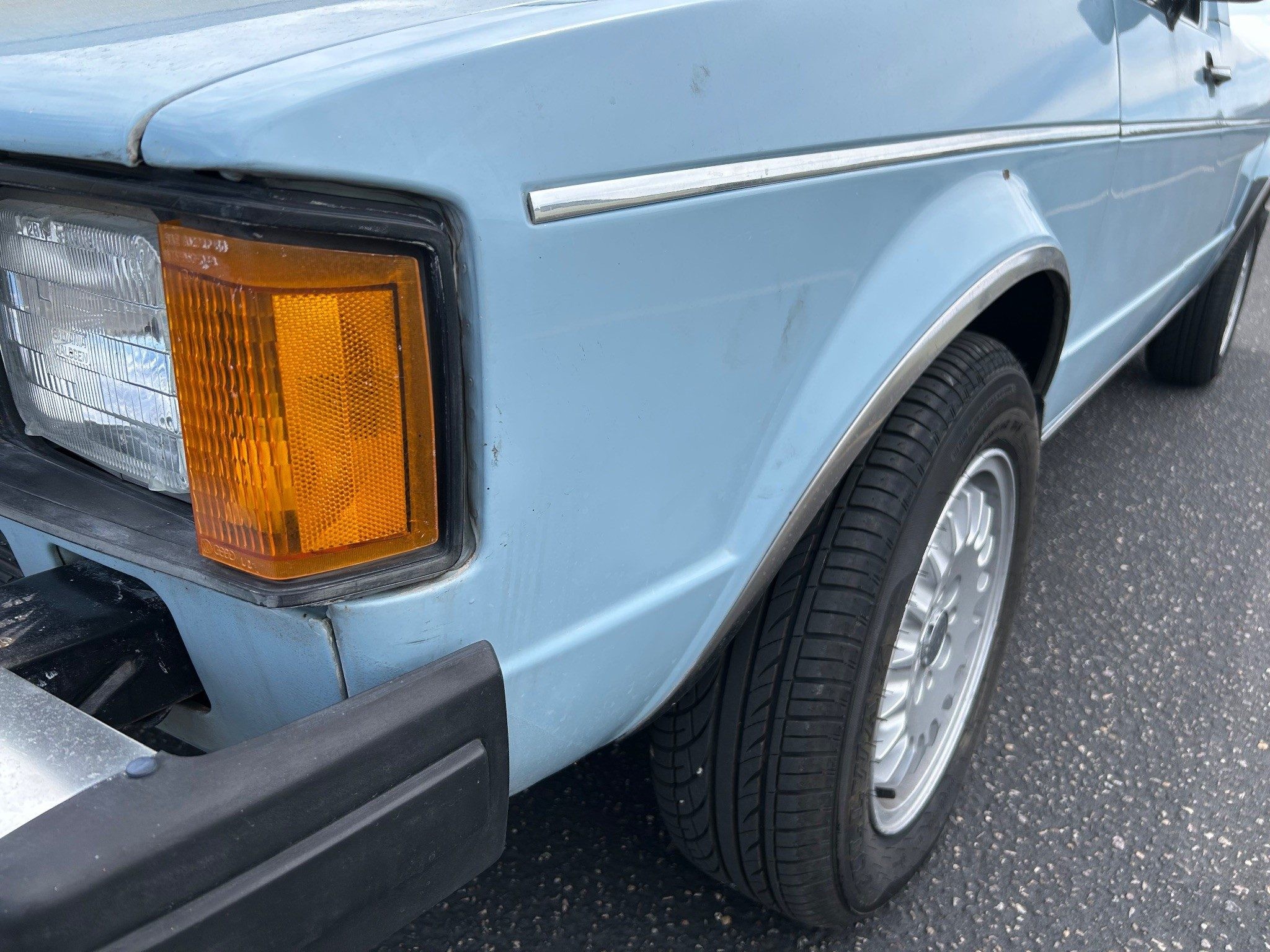 I will go through all things I feel could be fixed. Rear bumper right side bent in, taillights could be polished, mudflaps replaced, rear window trim piece replaced or replace rubber with no-trim rubber, rubber seals around driver and passenger windows are ok but old, vent wings (I fixed by taping off and sandblasting hardware mount points and JB Welded) could be converted to Cabriolet wings, original paint is ok but a paint-job would be nice, small surface rust spots. Interior: window roll-up handles plastic is gone, rear view mirror has black splotches around edge, a/c doesn’t blow cold- haven’t tried to charge it, ashtray cover replaced with abs plastic and installed 12v outlet, carpet needs steam cleaned. Things I did: new windshield with no-trim rubber, new wipers, replaced all motor mounts, replaced injection pump distributor o-ring, new tires on BMW E30 wheels, painted tailgate (paint had come off), professional Rhino-Lining bed, lubed everything I could.