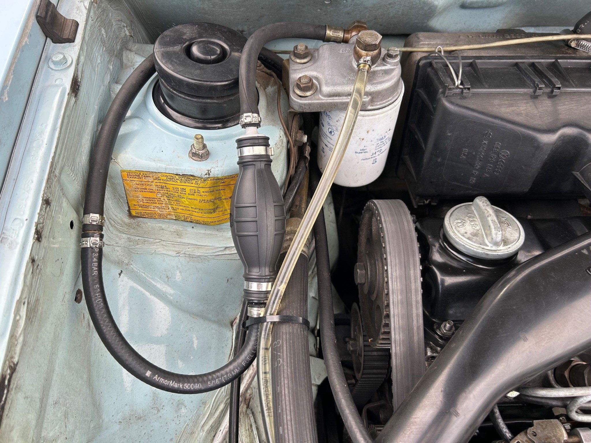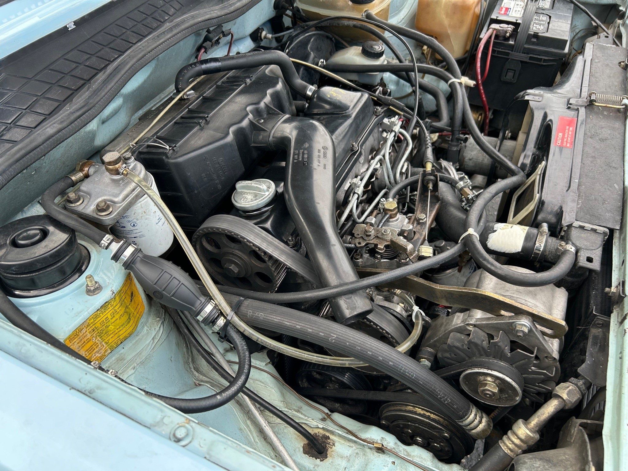 I just watched the video. As a VW Diesel Mechanic in the 1970’s-1990’s, I can observe the timing belt is way too loose. There is a belt tension tool, but it should be tight enough you can barely twist it about 45 degrees max. They do whine, but jumping a tooth or two will destroy the engine. And it needs a factory belt cover to keep debris from getting into the drive & throwing the belt. Nice Time Capsule!