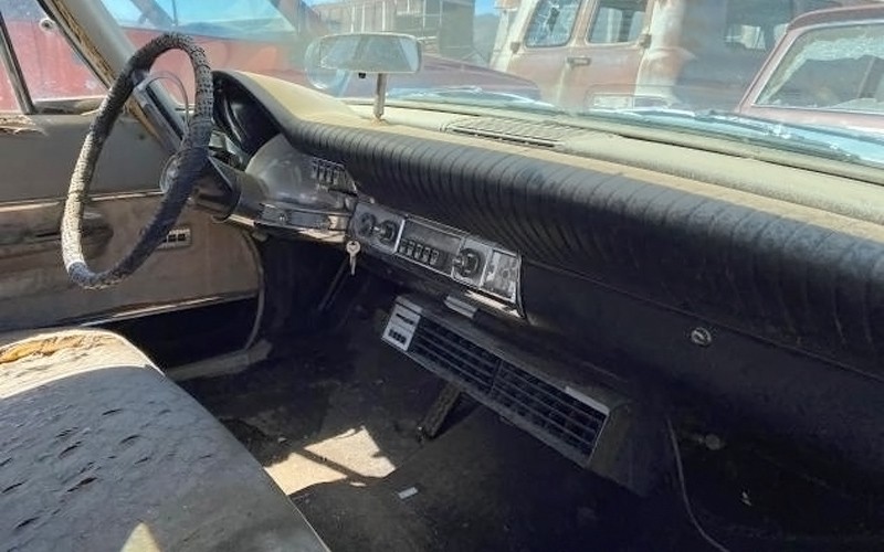 Surprisingly, the dash doesn’t appear to be cracked but a lot of the other soft parts will need to be replaced. The rubber gaskets and windlace, front and rear seat and door card upholstery, of course. And, the horn ring appears to have a crack in it so the next owner will have to do some scouting to find parts. Typically, trim and interior parts are the hardest to find during a restoration unless you’re lucky enough to have a car that has multiple aftermarket catalogs filled with parts. I always like to see power windows on a luxury car of this era, but the AC takes away from the otherwise sleek interior.