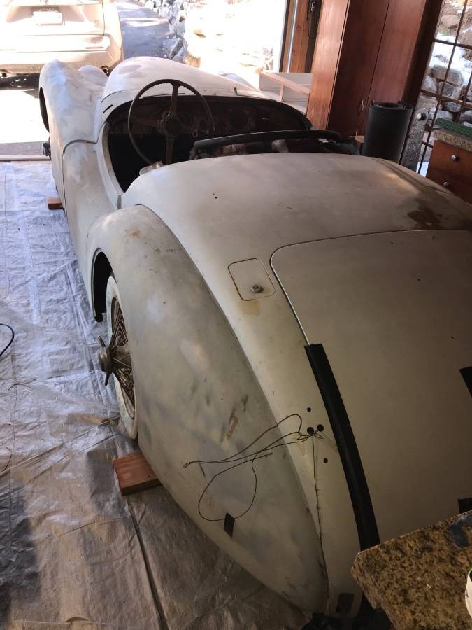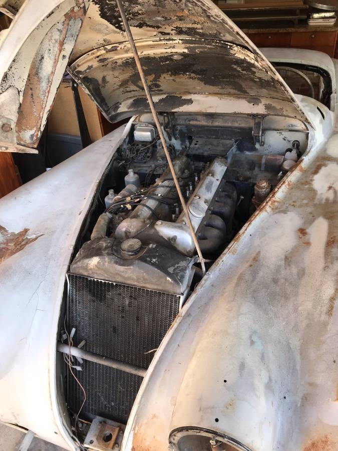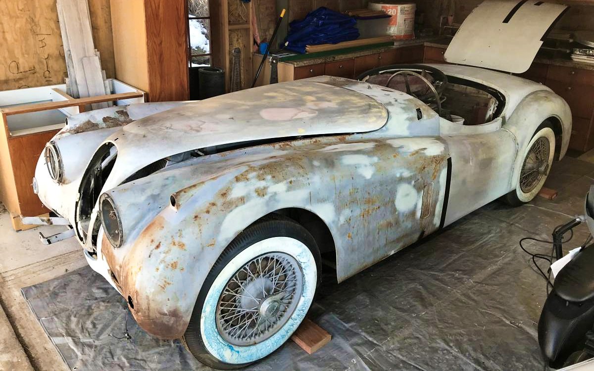 The original owner of the Jaguar dismantled it with a view to undertaking a full restoration, but this never eventuated. The current owner strongly reassures us that the car is complete and that every part that has been removed by the original owner is actually present. He says that the car is as solid as a rock, with the only rust being a small area in one corner of the battery tray that is showing some rot. This is a very common fault and is quite easy to fix. The frame is said to be clean, and while there is no evidence of any real accident damage, the owner says that there is some evidence of some very minor dent repairs. He believes that judging by the techniques that have been employed, these repairs were probably performed at some point in the 1950s or 1960s. The rest of the panels look essentially straight, and whipping them into shape for a fresh coat of paint should be an easy task. One interesting inclusion with the Jag is an aftermarket fiberglass hardtop. This appears to be in good condition, although the rear window does look like it might be a bit cloudy.