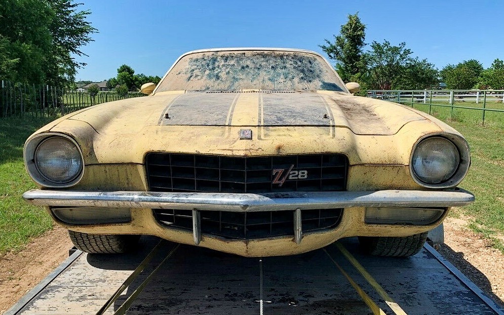 Dusty and not too rusty, this 1972 Chevrolet Camaro Z28 in Springtown, Texas features most of its important numbers-matching original equipment including engine, four-speed manual transmission, intake, and carburetor. The original exhaust manifolds vanished, replaced by headers. More than 30 bids here on eBay have set the market value beyond $12,500. Some may wonder why some ’72 Camaros have a full-width bumper and some do not. The RS package cars featured a different nose and bumpers. This nose and bumper are consistent with a non-RS Z28.