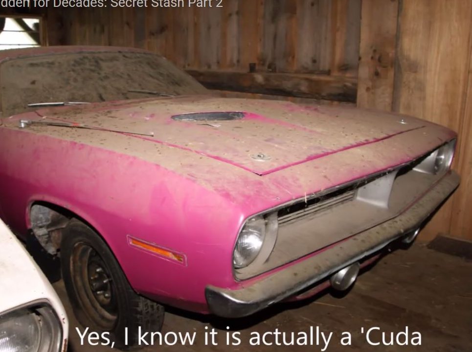 We know that a “Barn Find” has come to encompass many sorts of finds even when the “barn” is a garage or a storage unit or even a field. If you want to see one awesome barn full of mostly Mopars, check out this YouTube video of an East Coast barn. For the record the caption is part of the video. While the term ‘Cuda began as a casual nickname for the potent Plymouth Barracuda, Plymouth formalized it with the ‘Cuda option package in 1969. Read more here. But enough about that! If this 340-powered ‘Cuda is wearing factory-applied FM3 Panther Pink / Moulin Rouge paint, it would be one 126 painted in this snappy color. The 340 was one of the hottest small-blocks going at the time.