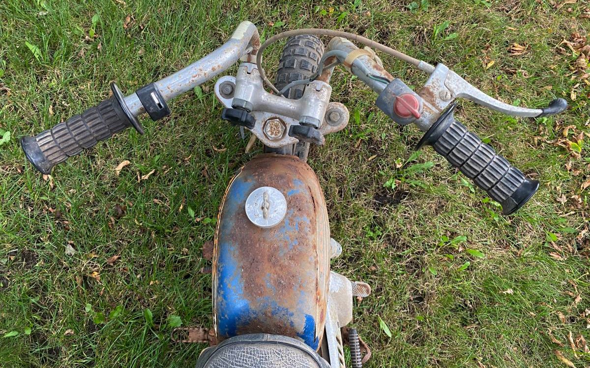 Hey, the hand grips look good! Otherwise, man does this thing need a lot of work. Luckily, they’re tiny so you can restore this one easily in a one-car garage while still parking in there for the upcoming winter. Unless you live where it’s warm out in the winter and if that’s the case, well, you’re luckier than I am and I hate you. Just kidding, sort of. There is no clutch on this bike, or I should say, it has a three-speed automatic clutch transmission so you don’t need to pull in a clutch lever and shift, it does the shifting for you.
