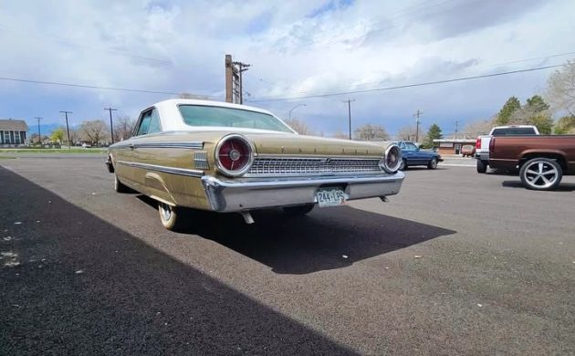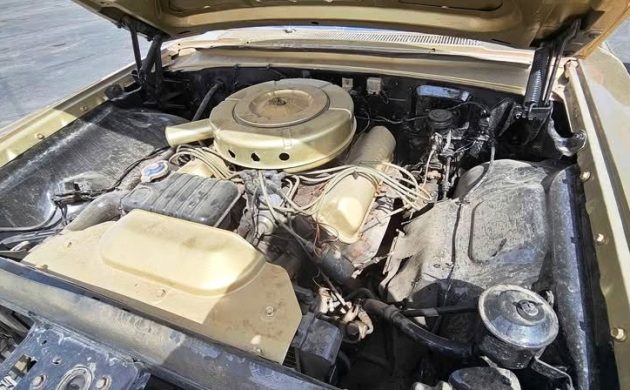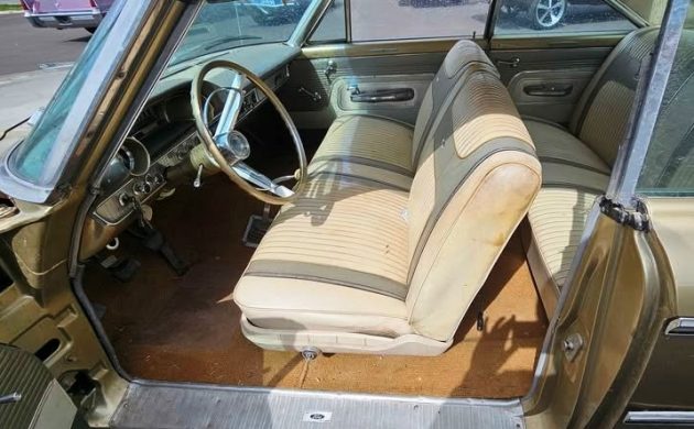 Despite looking like a high school attempt to extend the gold body color as a theme in the engine compartment, the gold-painted air cleaner and rocker covers are true to factory. That panel atop the radiator came black, but only purists would decry an extra splash of gold. Ford offered an array of five transmissions and eight engines for ’63 1/2, including three 390s. The seller describes a three-speed manual with overdrive, which seems a bit odd. I owned a Ford with a similar configuration; my 1985 F250 came with a four-speed manual box, but I only used the “creeper” first gear to pull vehicles from ditches or stumps from the ground. That left three road gears: Low, a 1:1 Second, and an Overdrive third. It did surprisingly well for a small-block powered 3/4 ton 4×4, reaching 60 MPH in around 14 seconds and a consistent 20 MPG on the highway. Expect even better numbers from this Galaxie. Thanks to Wikipedia for some details.