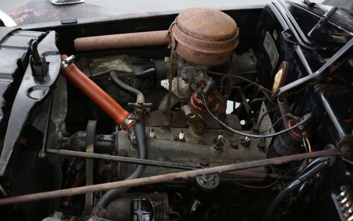 Power, when running, is provided by a 52 HP, 1.7 (almost 1.8) liter in-line, four-cylinder engine operating through a four-speed manual transmission and driving the rear wheels. The engine looks intact, other than some missing spark plug leads. Nevertheless, it probably hasn’t turned a lick in many moons. No word if it will turnover by hand.