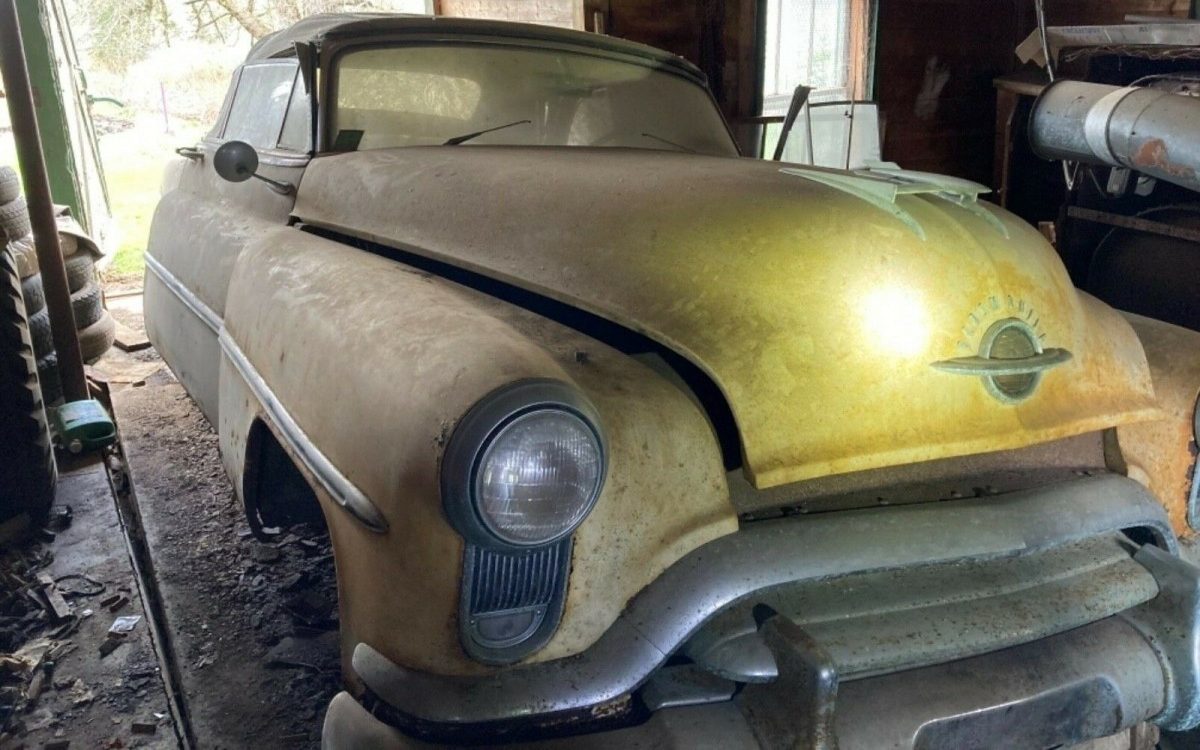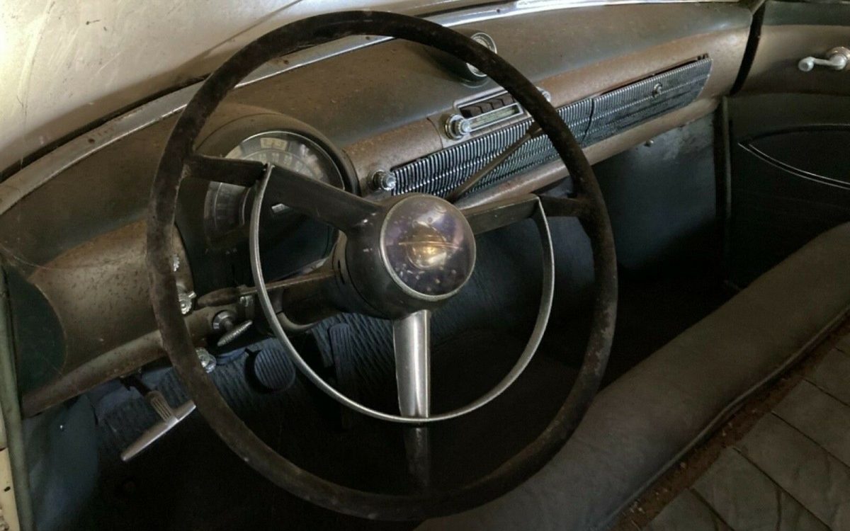 Under the hood looks just about as complete as the rest of the car, with a similar amount of barn dust. The high-compression, overhead-valve Rocket V-8 engine has all of its wiring, the oil bath air cleaner, and carburetor, all bits that generally come off to be used in the owners’ other projects. The seller doesn’t say if it runs, but I’d be willing to bet that it doesn’t. The thick layer of dust on every visible surface looks like at least two decades’ worth of build-up.