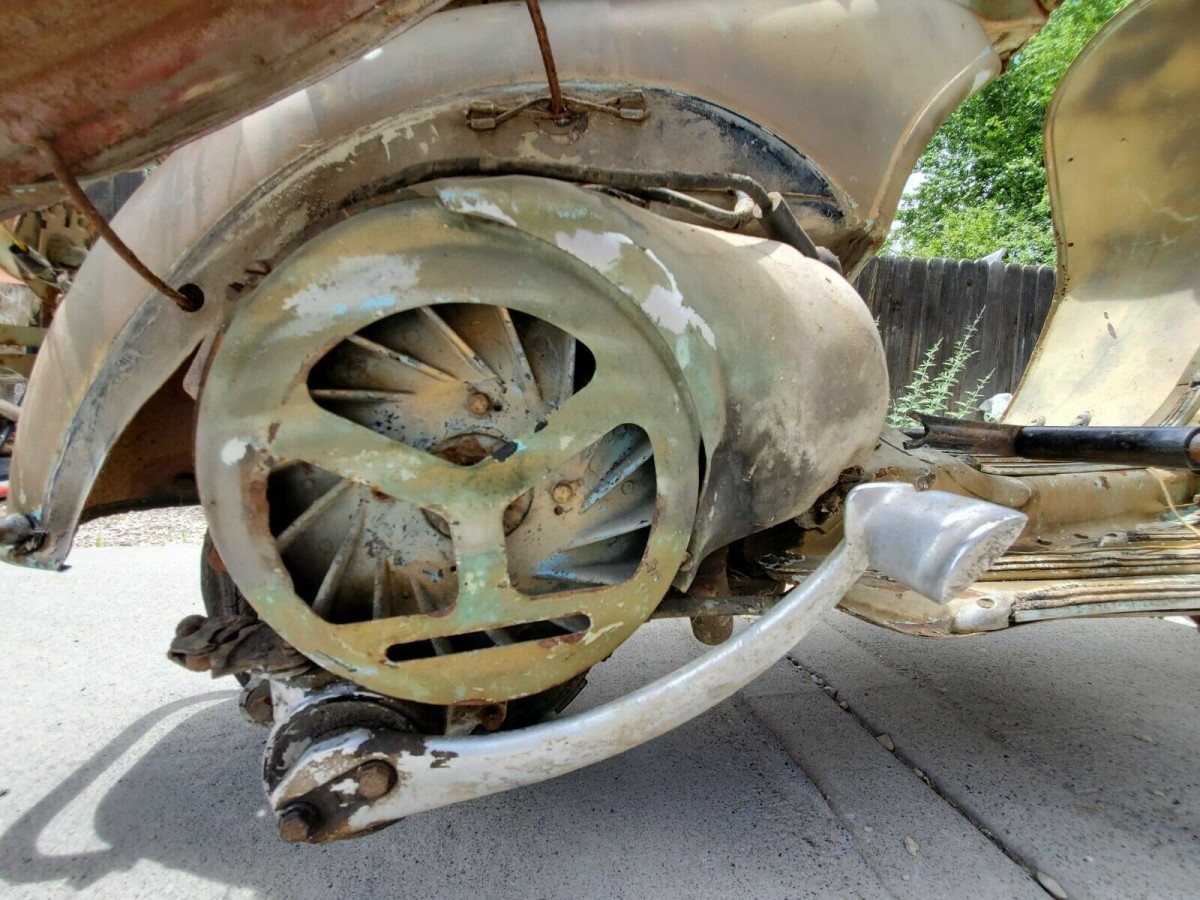 Wherever the name came from, Piaggio had a hit, and as numerous models followed over the years, engine sizes steadily increased, eventually resulting in the production of the large frame models, like this 150. Named for its one-cylinder engine, which produced either 5.4 or 5.8 hp (depending on which source you believe), this Vespa had a reported top speed of just over 50 mph. Although it’s been repainted and it does show its age, there is a lot to like here. Aside from the front wheel, the rust does not appear to be fatal– take a look at the underside here. The most obvious flaw is the tail light, which isn’t original. Curiously, both the tail light and the horn are powered by a dynamo attached to the engine, so neither would ordinarily work when the scooter isn’t running. The headlight and other electrical equipment is directly powered by the 6v battery.