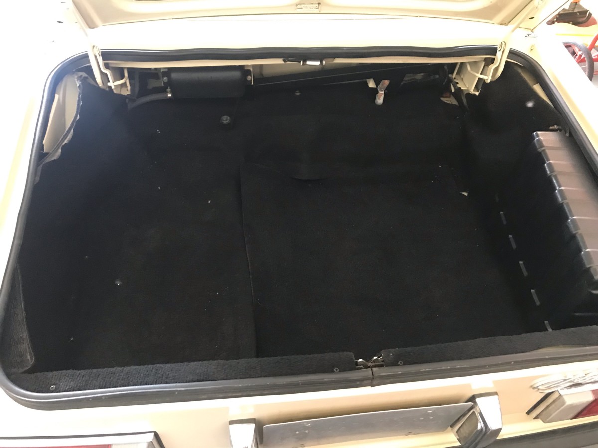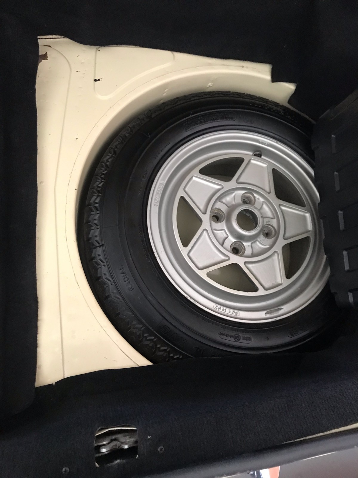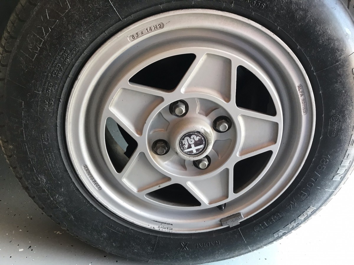 The rear bumper and door panels were removed at some point in the car’s life, but Don just had them reinstalled and it really cleaned the look of the car up. The Veloce came with leather seats, power mirrors, power locks, air-conditioning, and the aluminum wheels that you see on this car. There appears to be some wear inside on a couple of areas but this car only has 54k miles on it so it is in very nice shape overall. Photos of the trunk area reveal an original spare, jack, solid floors, and the original trunk liner.