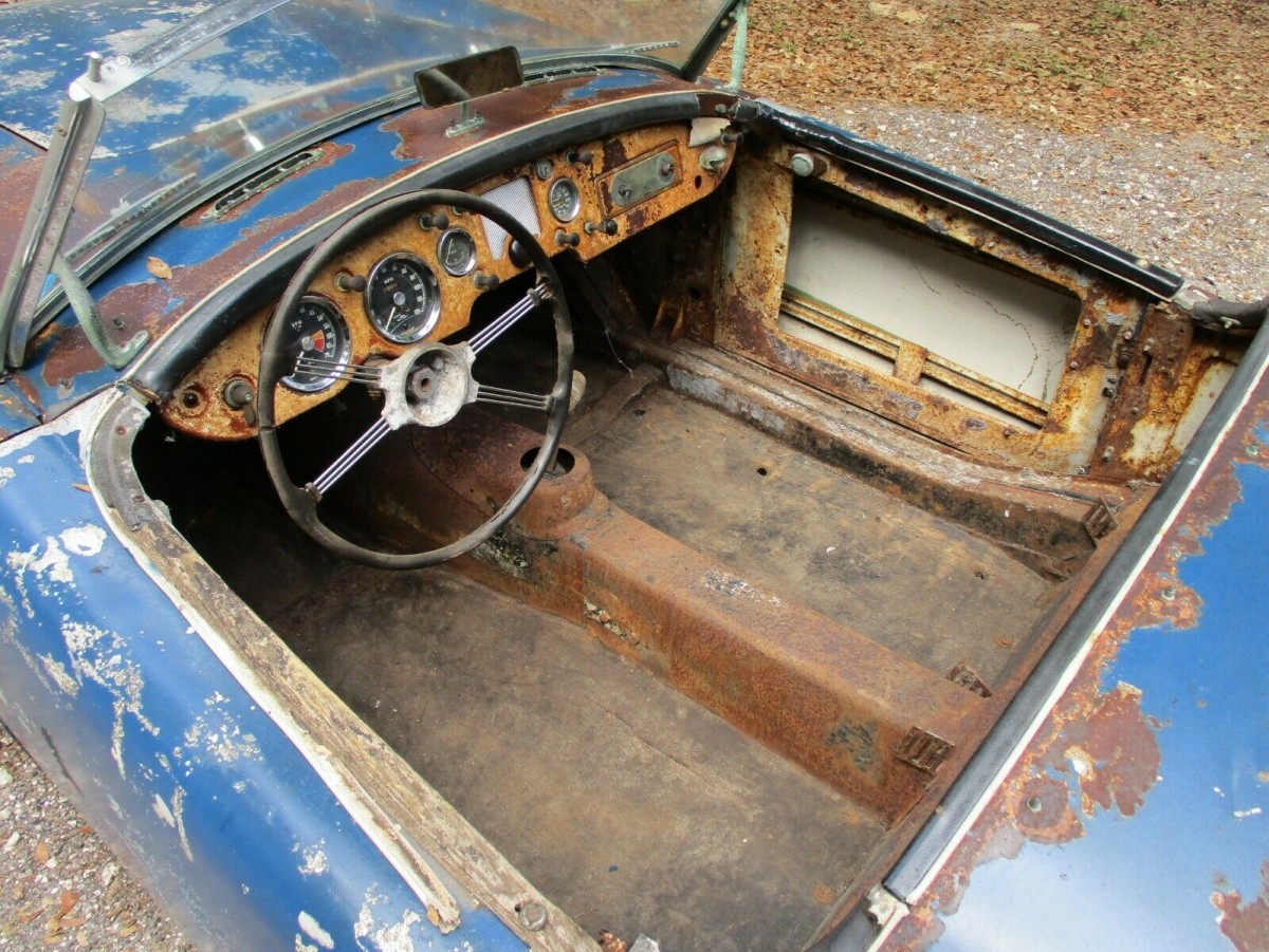 Lacking all of its upholstery, this MGA reveals that it has reasonably solid floors. The dash is well weathered, but still sports its original gauges, and a neat old Motorola radio. Suffering a few small chips and breaks, the banjo steering wheel would need attention. The top frame is included with the car, but like the interior there is no upholstery for the top either.