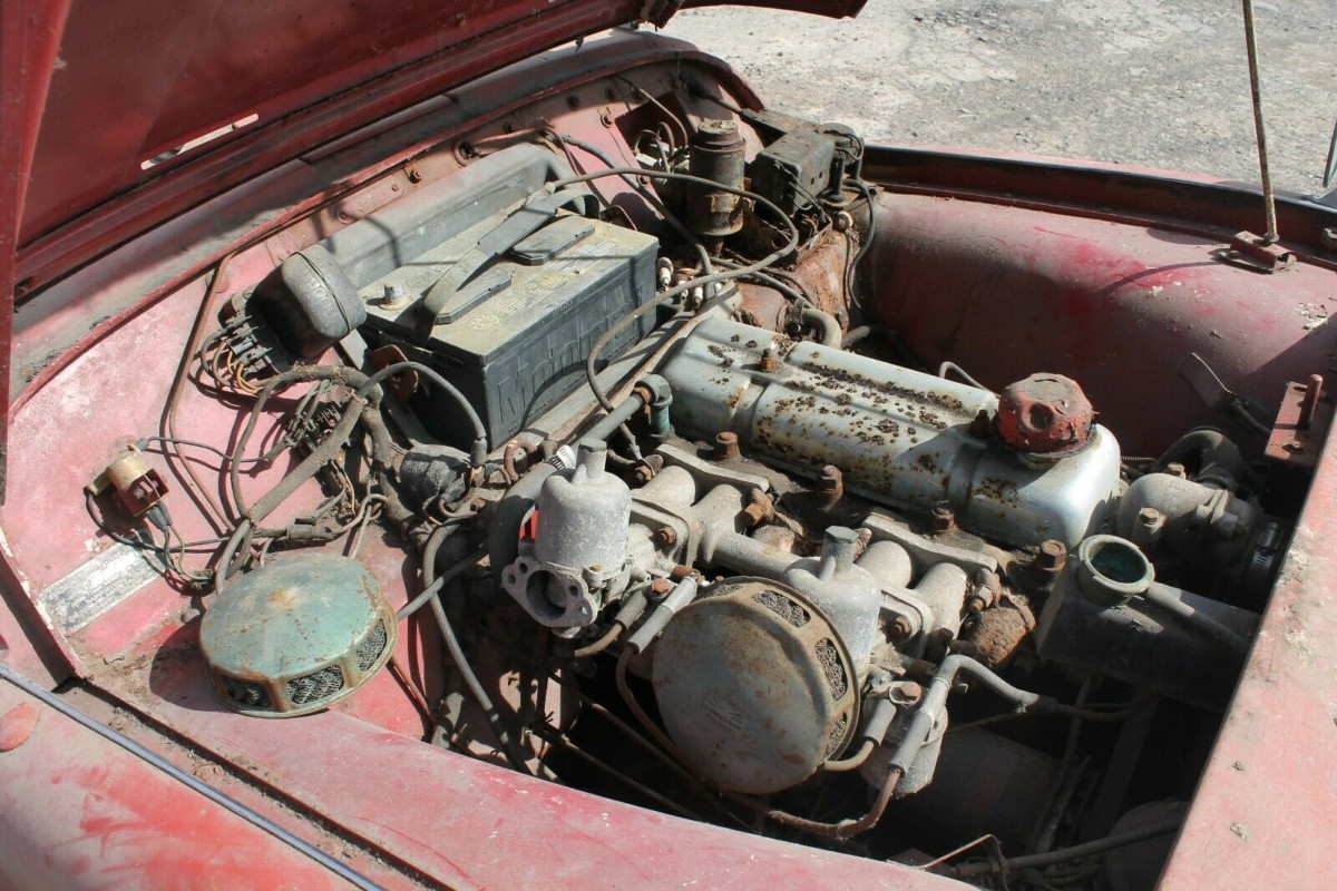 Out in the daylight, the TR3 looks quite attractive sitting low on wire wheels with a matching red interior. The body looks good overall, but you can see where the seller has noted the presence of rust, which is in the rockers and lower fenders. While this will warrant repair, it doesn’t look all that bad, especially for a vintage car residing in the snow belt. In fact, I’d bet it would have been even rustier if it hadn’t gone into long-term storage in the early 80s. The TR3 looks complete, with most if not all trim accounted for, and a soft top that appears salvageable from a distance. All lenses and chrome pieces look to be intact as well.
