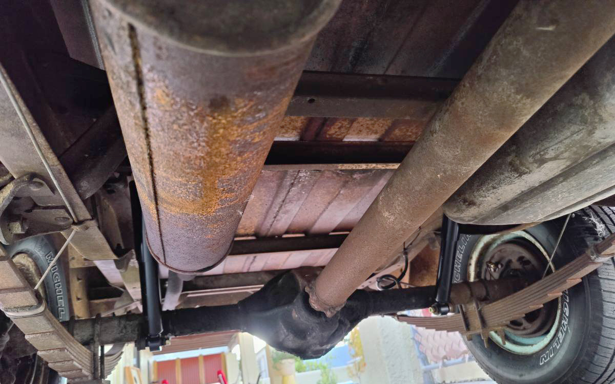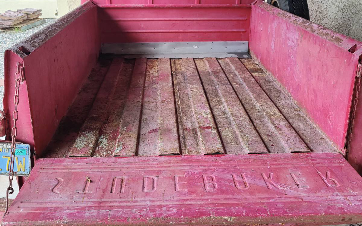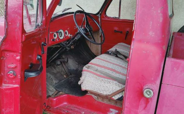 Clearly, it’s been repainted at some point, as seen on the door striker and other areas, but maybe that helped to preserve it. When it was found in that “garage basement,” it hadn’t been driven since 2007. It has a three-speed manual with a column shifter, as expected, and other than the goopy and faded paint, it really looks solid. The seller even included an underside photo or two, well done! The bed looks solid, other than the front edge by the cab, which is showing some sort of patch panel. They say it is a solid truck, other than surface rust underneath.
