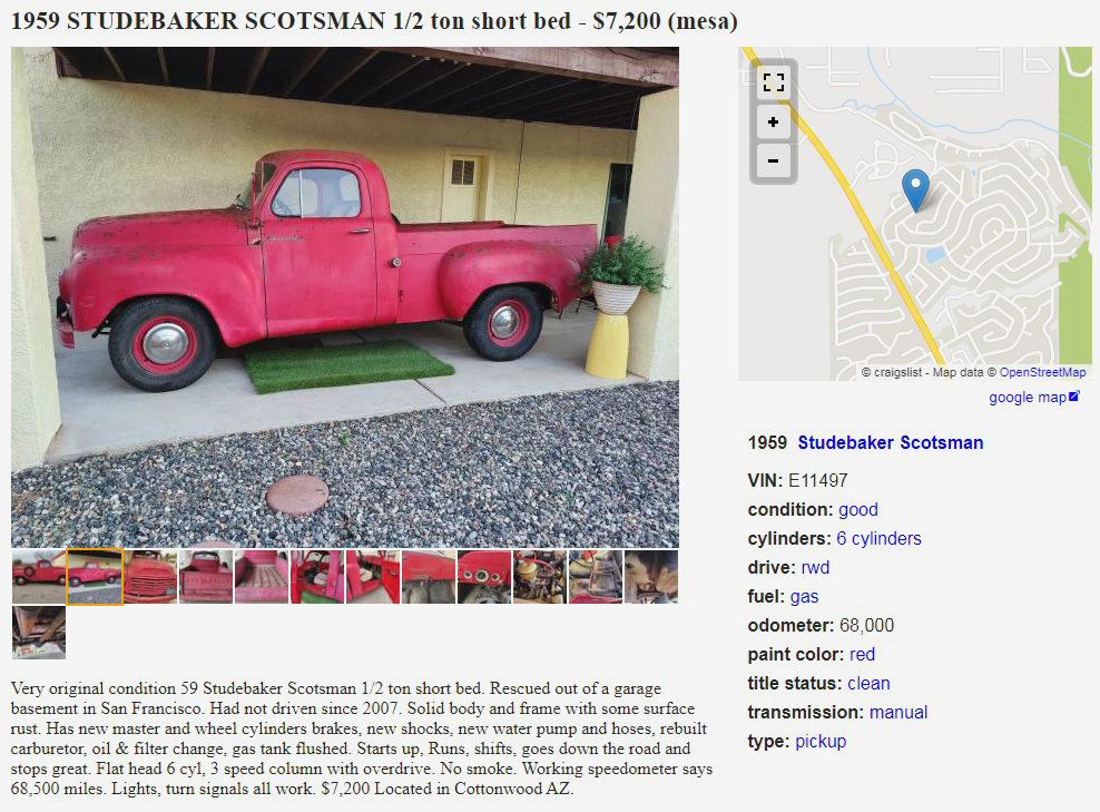 I’m assuming a “garage basement” is a garage on the lower level of a split-level, or a “walk-out”-type house built on a slope with a basement and garage built into the hill, and an opening for a garage door? And they call me Cap’n Obvious, I wonder why? The seller of this 1959 Studebaker Scotsman pickup was found in such a space, and it’s posted here on craigslist in beautiful Cottonwood, Arizona, and they’re asking $7,200. Here is the original listing, and thanks to Barney for the tip!